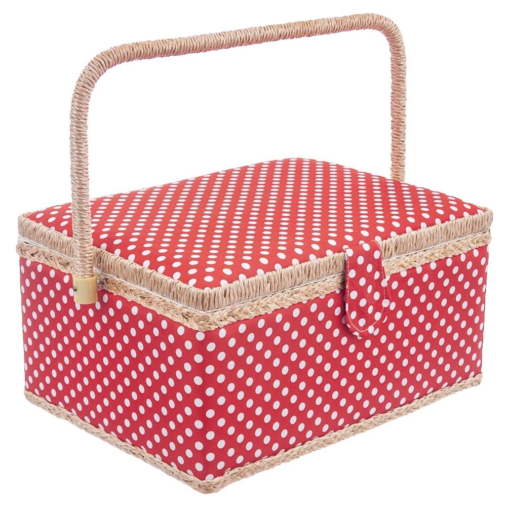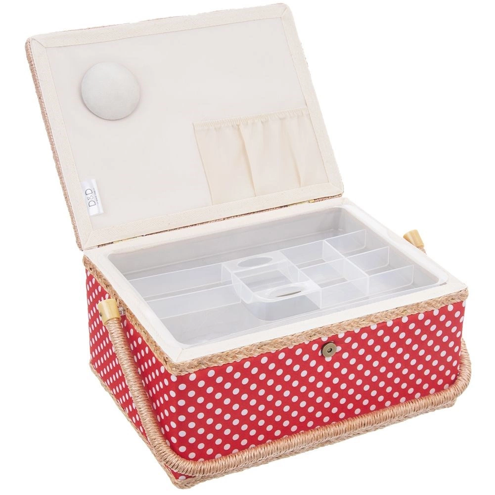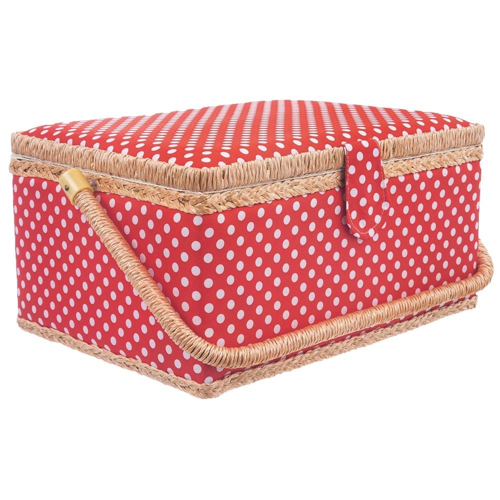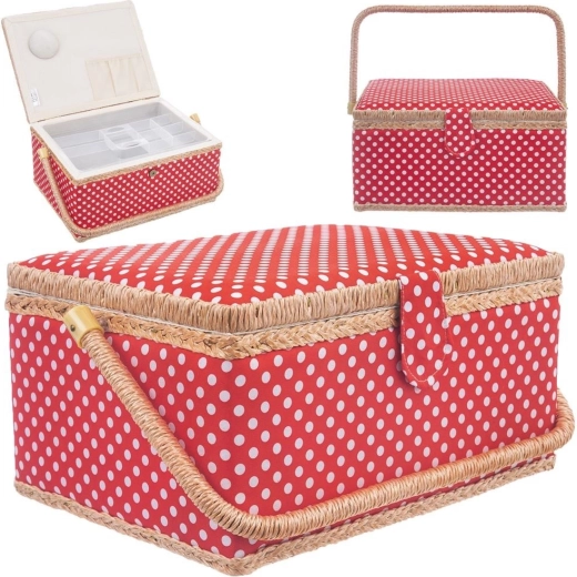 Αυτό το ραπτικό καλάθι συνδυάζει ελκυστικό σχεδιασμό και μελετημένη οργάνωση. Το σώμα του καλαθιού είναι επενδεδυμένο με κόκκινο ύφασμα με λευκά πουά και διαθέτει στιβαρό χερούλι για εύκολη μεταφορά. Χάρη στο μαγνητικό κούμπωμα κλείνει με μία κίνηση και το περιεχόμενο μένει στη θέση του ακόμη και κατά τη μεταφορά.