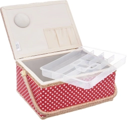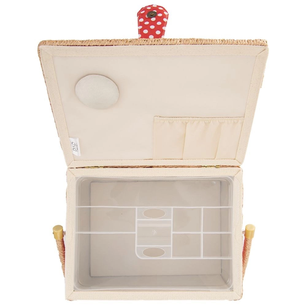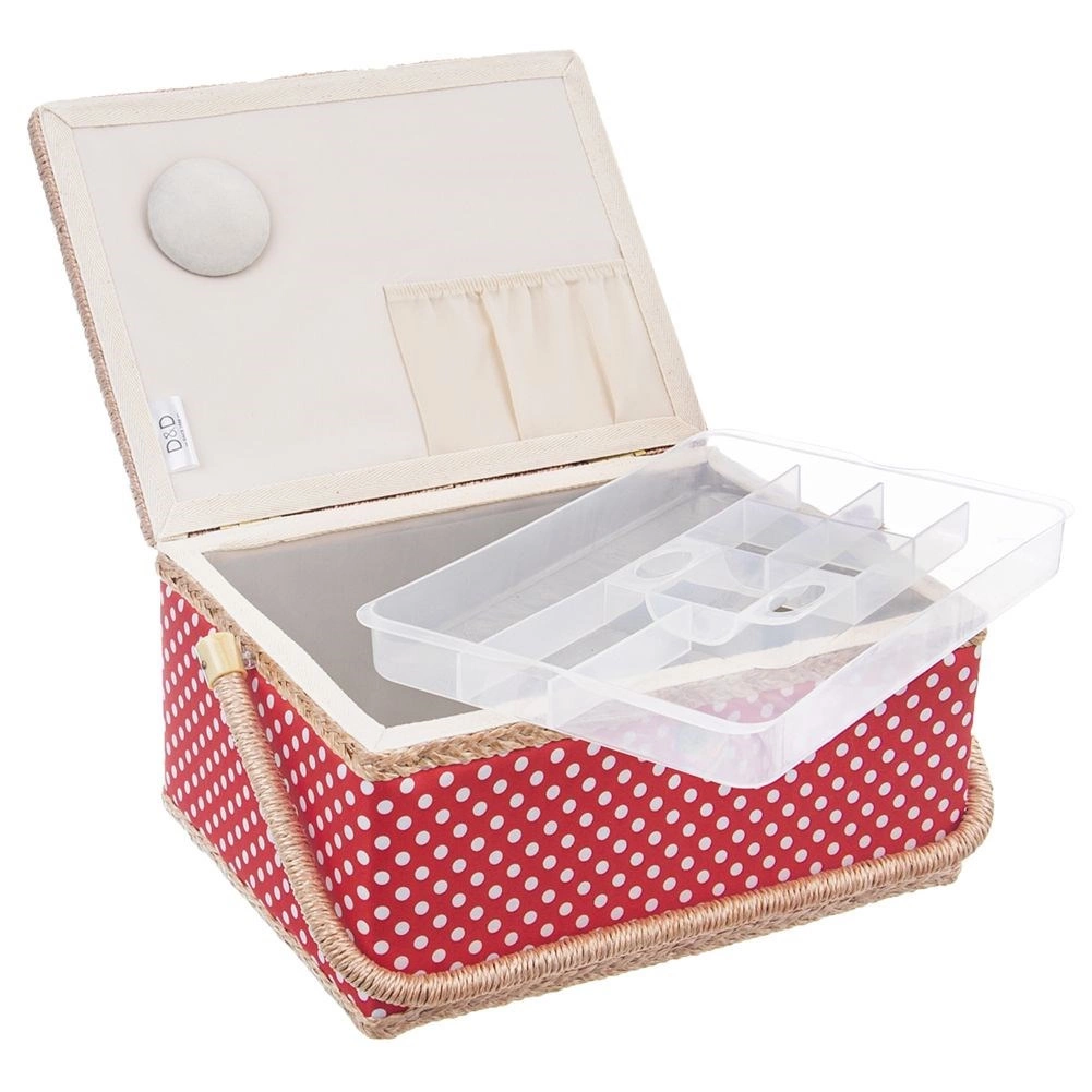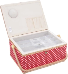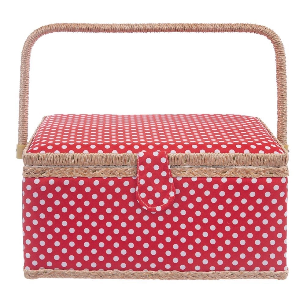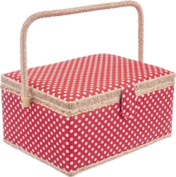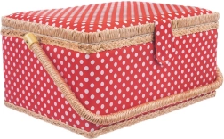 Αυτό το ραπτικό καλάθι συνδυάζει ελκυστικό σχεδιασμό και μελετημένη οργάνωση. Το σώμα του καλαθιού είναι επενδεδυμένο με κόκκινο ύφασμα με λευκά πουά και διαθέτει στιβαρό χερούλι για εύκολη μεταφορά. Χάρη στο μαγνητικό κούμπωμα κλείνει με μία κίνηση και το περιεχόμενο μένει στη θέση του ακόμη και κατά τη μεταφορά.