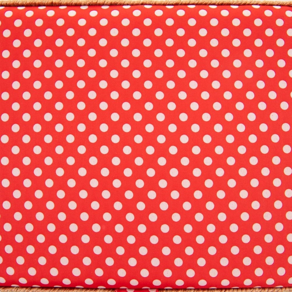 Κόκκινο ύφασμα με λευκά πουά και διακοσμητική πλέξη που χαρίζει στυλ στο ράψιμο και ταιριάζει όμορφα σε κάθε οικιακό εργαστήριο.
