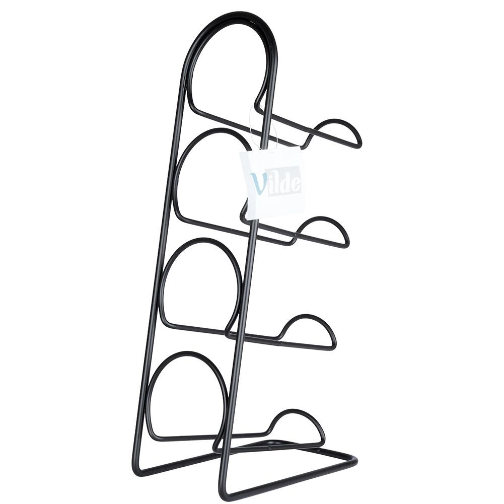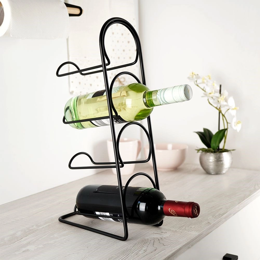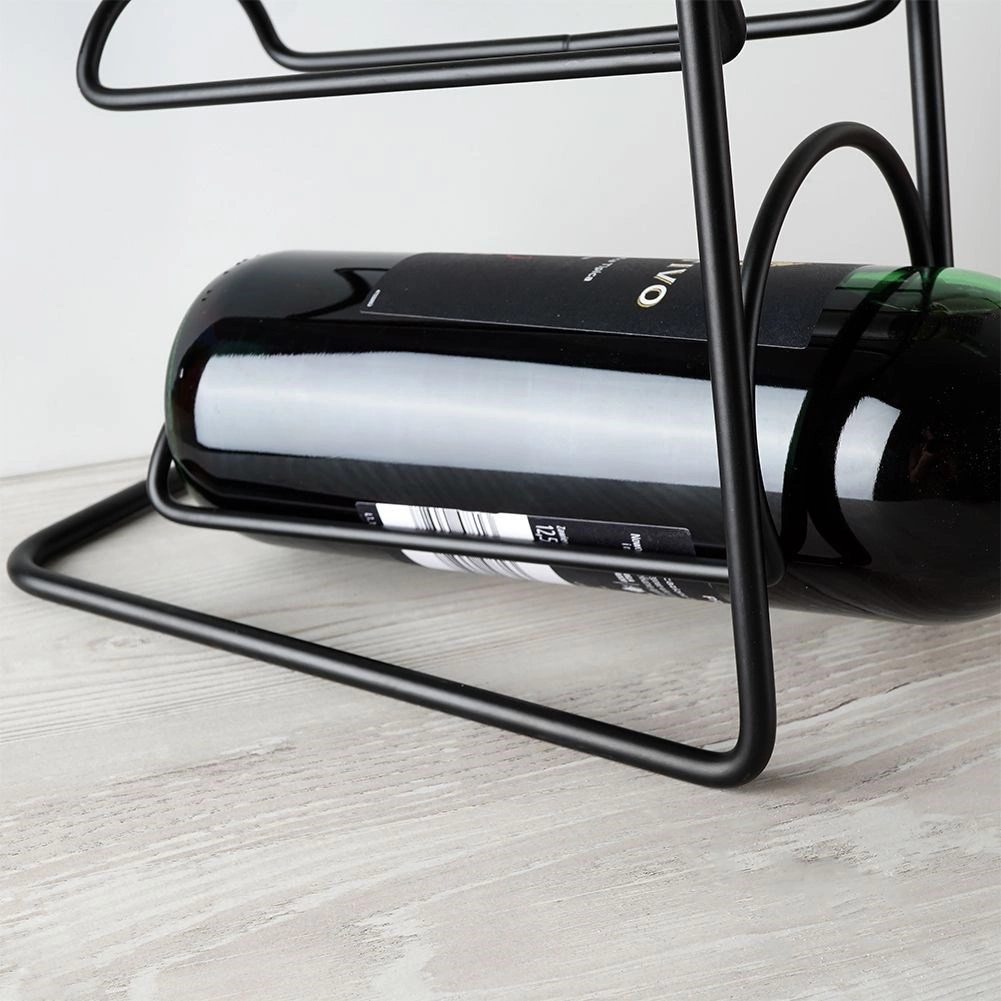 Πρακτική και εντυπωσιακή βάση για κρασί με μινιμαλιστικό συρμάτινο σχεδιασμό, χωρά έως τέσσερις φιάλες κρασιού ή άλλων ποτών. Η στιβαρή μεταλλική κατασκευή σε ματ μαύρο χρώμα είναι ανθεκτική, σταθερή και εύκολη στη συντήρηση. Χάρη στην οριζόντια τοποθέτηση των φιαλών, το κρασί μένει σωστά ξαπλωμένο και ο φελλός παραμένει υγρός.
