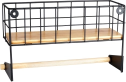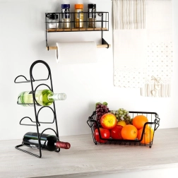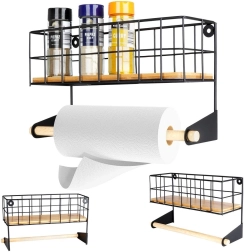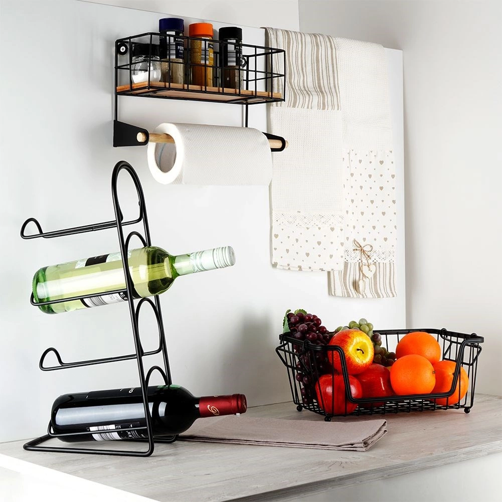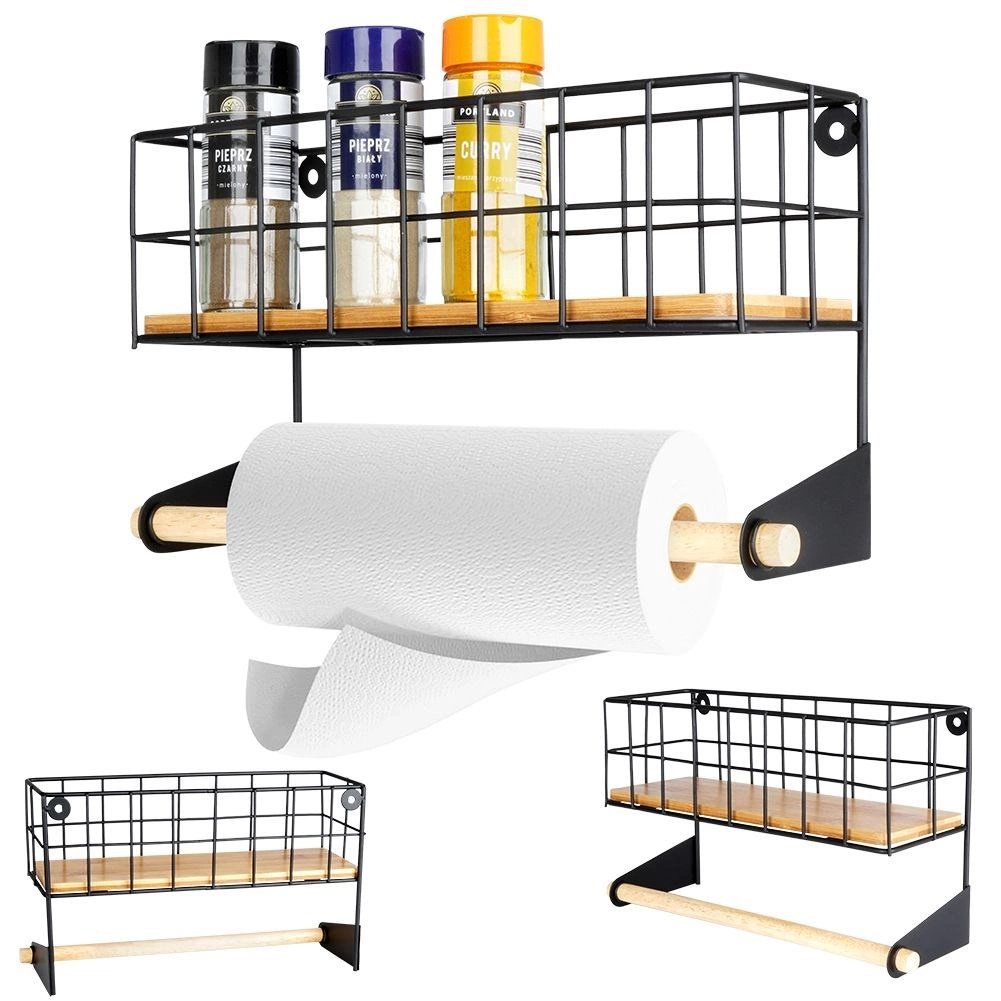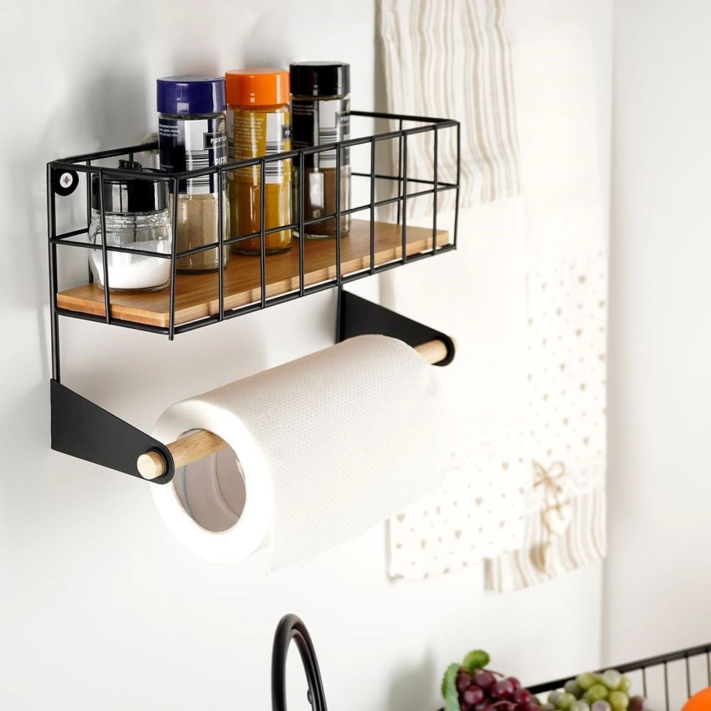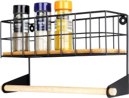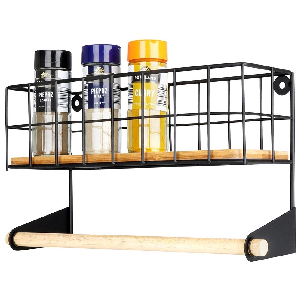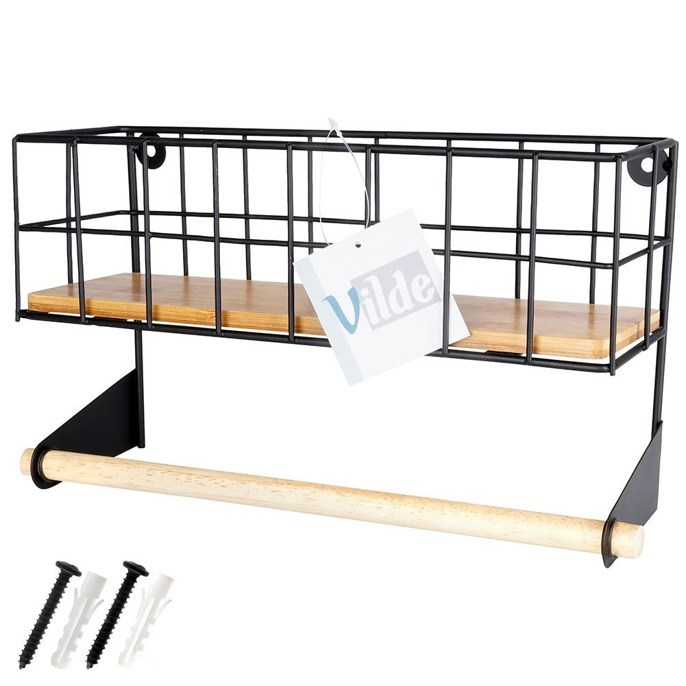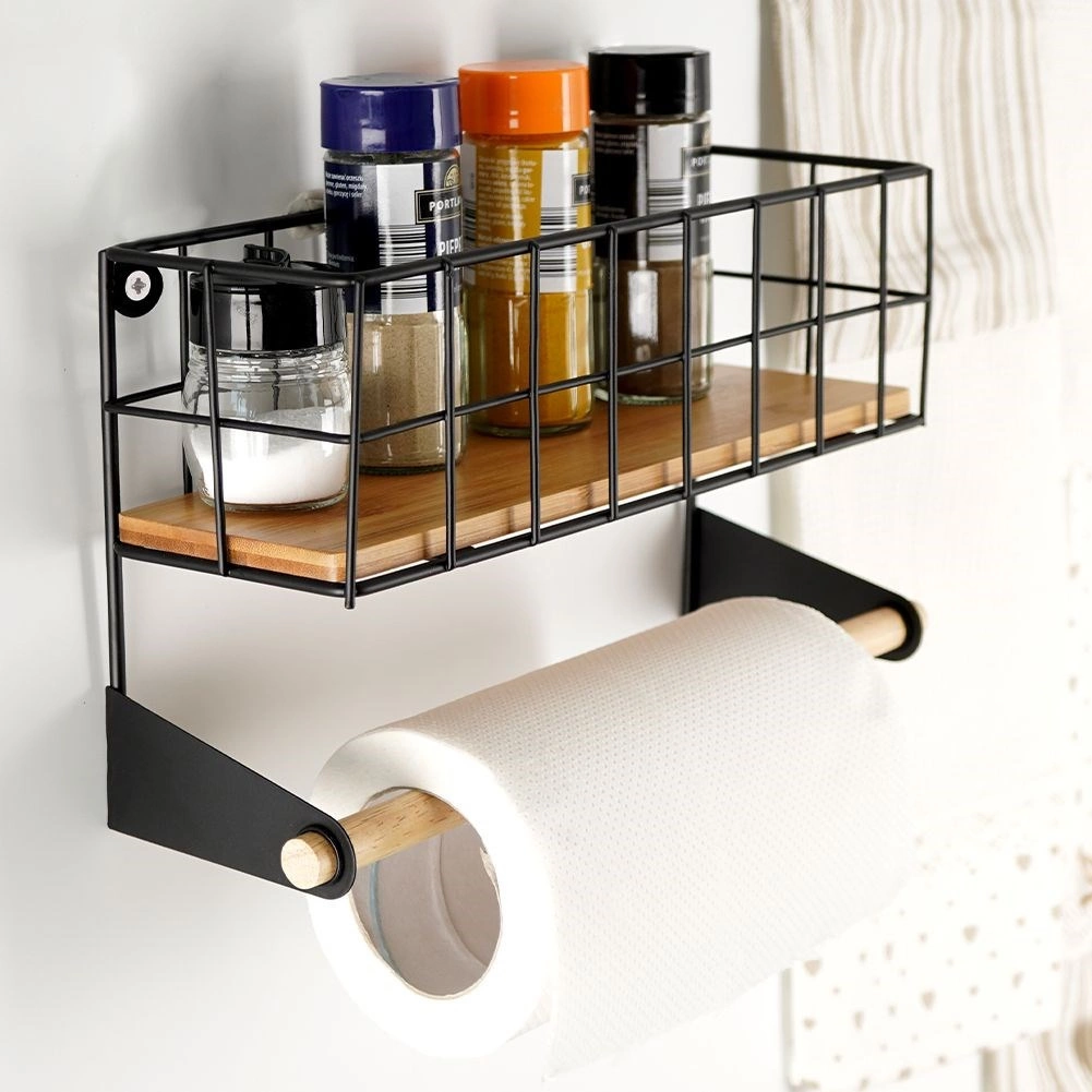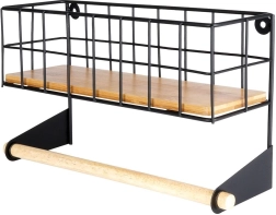 Αυτό το επιτοίχιο ράφι με ενσωματωμένη βάση για χαρτί κουζίνας βοηθά να οργανώσετε έξυπνα την κουζίνα. Το επάνω καλαθάκι χωράει μπαχαρικά ή μικρά βαζάκια, ενώ η κάτω ξύλινη ράβδος εξασφαλίζει άνετο ξετύλιγμα του ρολού. Η ανθεκτική κατασκευή από μαύρο μέταλλο με βαφή πούδρας και οι λεπτομέρειες μπαμπού προσδίδουν μοντέρνα βιομηχανική αισθητική στον χώρο.