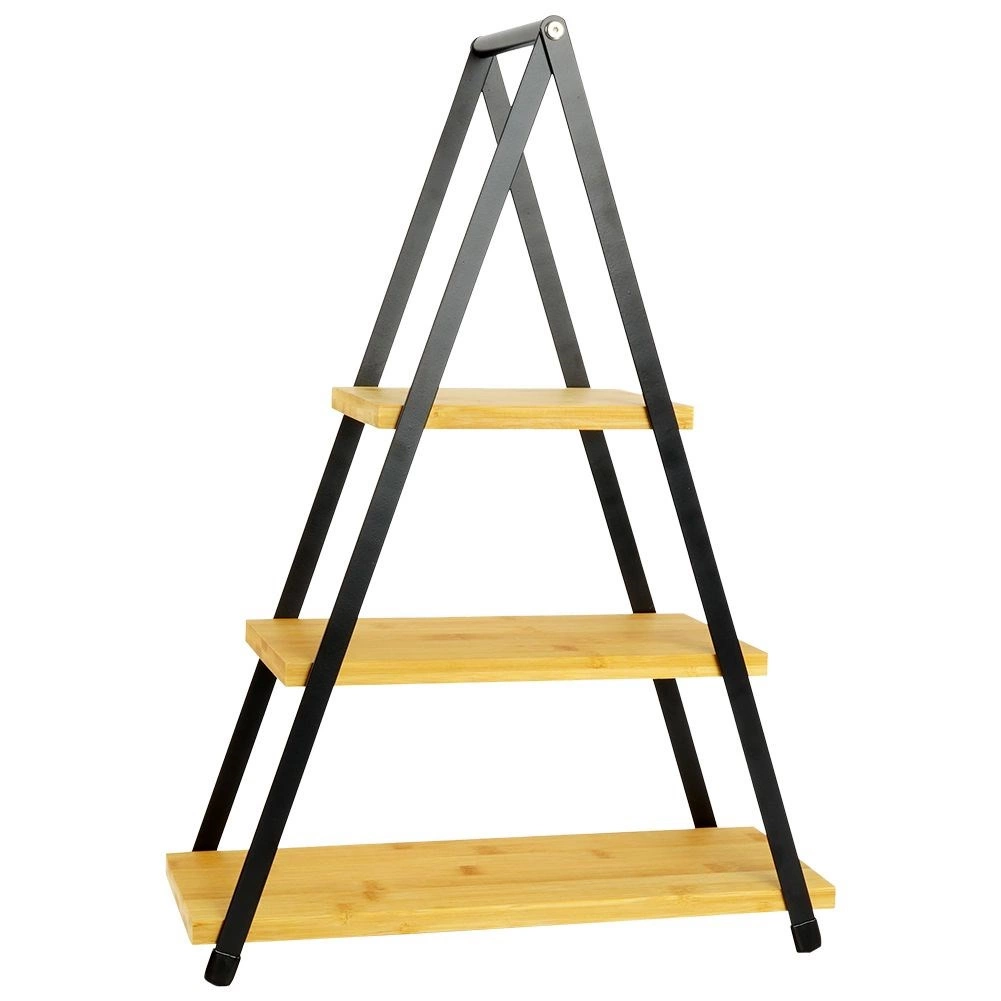 Κομψή τριώροφη σερβιριστική πιατελιέρα με μαύρο μεταλλικό σκελετό και ράφια από μπαμπού, ιδανική για επιδόρπια, φρούτα, τυριά και καναπεδάκια. Χάρη στον τριγωνικό σχεδιασμό εξοικονομεί χώρο, είναι σταθερή, εύκολα μεταφερόμενη με την επάνω χειρολαβή και ταιριάζει άψογα σε μοντέρνους και βιομηχανικούς χώρους.