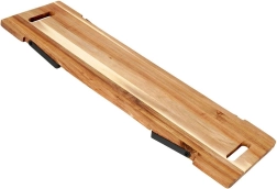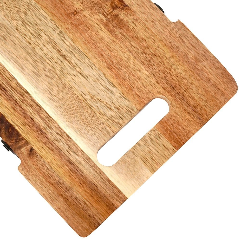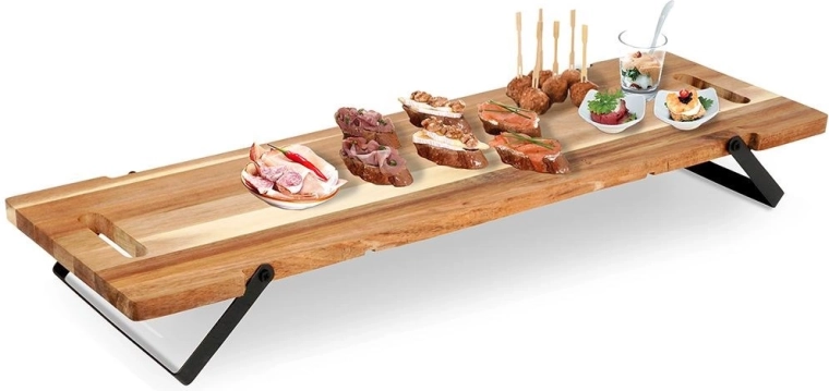 Αυτός ο μακρύς δίσκος σερβιρίσματος από ξύλο ακακίας με αναδιπλούμενα μεταλλικά πόδια αναβαθμίζει την παρουσίαση των πιάτων σας. Οι ενσωματωμένες λαβές στα πλάγια εξασφαλίζουν άνετη και ασφαλή μεταφορά, ενώ η υπερυψωμένη θέση διευκολύνει το σερβίρισμα και κρατά το τραπέζι τακτοποιημένο.