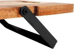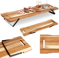 Κομψός ξύλινος δίσκος σερβιρίσματος από ακακία με αναδιπλούμενα μεταλλικά πόδια για εντυπωσιακή παρουσίαση φαγητών. Προσφέρει ενσωματωμένες λαβές για εύκολη μεταφορά, σταθερή υπερυψωμένη κατασκευή και ανθεκτική φυσική επιφάνεια κατάλληλη για τυριά, αλλαντικά, φρούτα, τάπας και επιδόρπια.