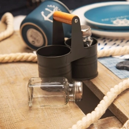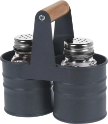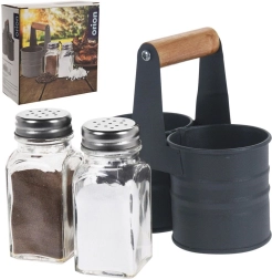 Κομψό σετ αλατιέρας και πιπεριέρας με γυάλινα δοχεία σε πρακτική μεταλλική βάση με ξύλινη λαβή. Συμπαγείς διαστάσεις 13 × 6 × 12,5 cm, χωρητικότητα κάθε δοχείου 75 ml. Άνετη δοσομέτρηση χάρη στα διάτρητα ανοξείδωτα καπάκια, εύκολος καθαρισμός και καθολική χρήση για το σπίτι και τη γαστρονομία.