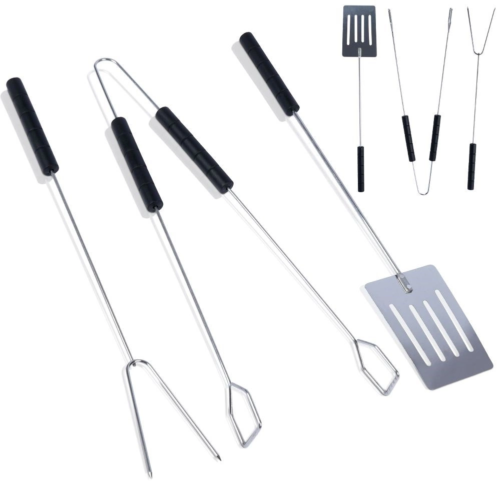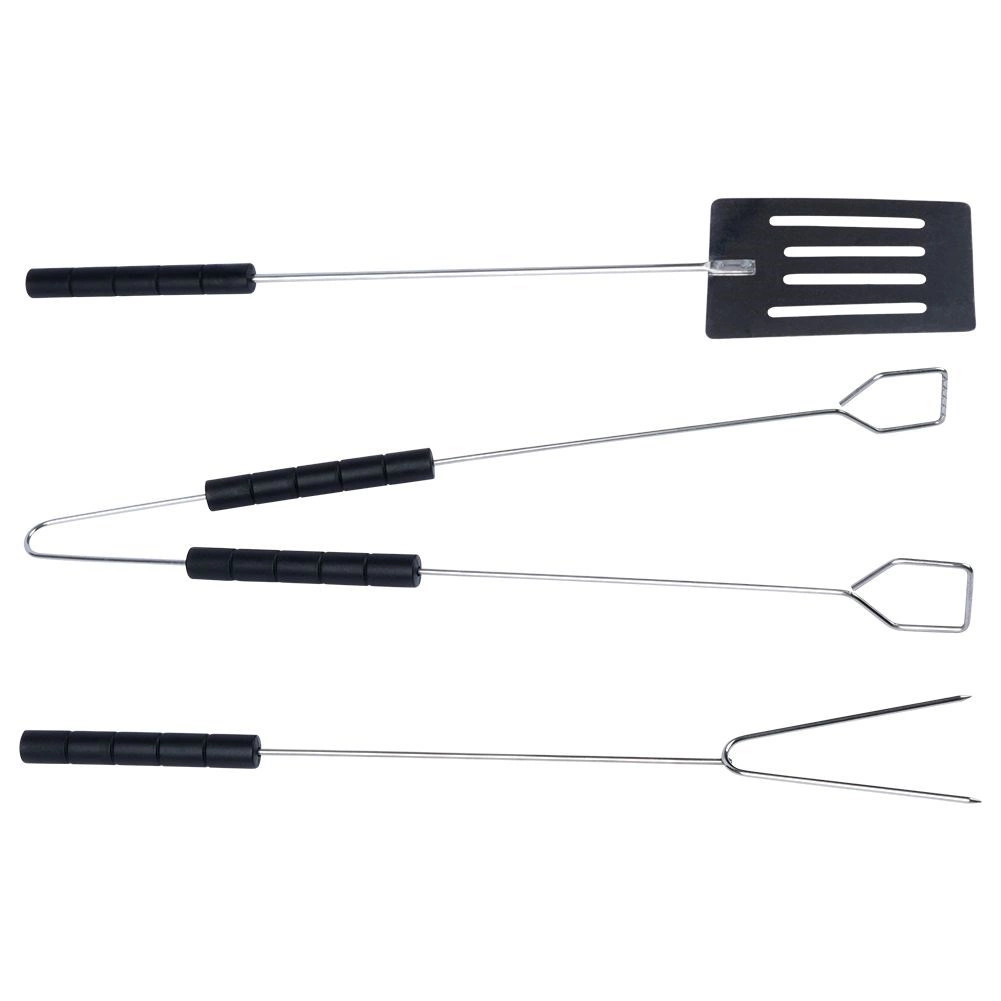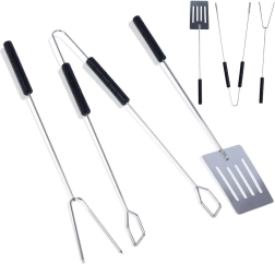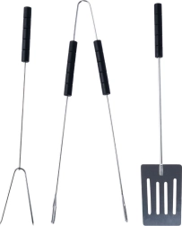 Πρακτικό σετ εργαλείων ψησίματος από ισχυρό ατσάλι που περιλαμβάνει σπάτουλα, λαβίδα και διχάλια μήκους 38 cm. Χάρη στις μακριές λαβές θα παραμένετε σε ασφαλή απόσταση από τη σχάρα, τα ανθεκτικά υλικά εξασφαλίζουν μεγάλη αντοχή και οι άνετες αντιολισθητικές λαβές διευκολύνουν τον χειρισμό των τροφίμων στο σπίτι και στον κήπο.