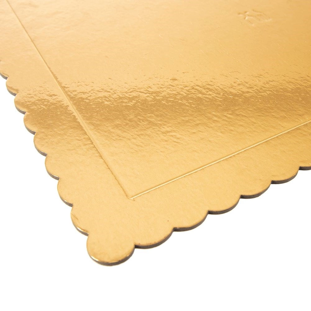 Κομψή και πρακτική επιλογή για οικιακή και επαγγελματική ζαχαροπλαστική. Η ορθογώνια βάση με χρυσό φινίρισμα και διακοσμητικό κυματιστό/οδοντωτό περίγραμμα αναδεικνύει την εμφάνιση κάθε τούρτας ή γλυκίσματος. Είναι κατασκευασμένη από παχιά, πολύ ανθεκτική χαρτόνι, που δεν παραμορφώνεται και μεταφέρει με ασφάλεια ακόμη και μεγαλύτερα και πολυώροφα επιδόρπια.