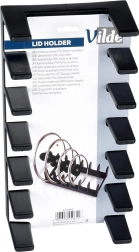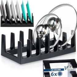 Πρακτική βάση για καπάκια και πιάτα με διαστάσεις 28 × 15 × 9 cm, που χωρά έως 6 τεμάχια. Χάρη στο ανθεκτικό πλαστικό σε μαύρο χρώμα είναι ελαφριά, καθαρίζεται εύκολα και έχει μεγάλη αντοχή. Μπορείτε να τοποθετήσετε καπάκια, ρηχά και ορισμένα βαθιά πιάτα ή επιφάνειες κοπής, διατηρώντας τάξη στο ντουλάπι ή στο συρτάρι της κουζίνας.