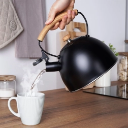 Αυτή η στιλάτη τσαγιέρα από ανοξείδωτο ατσάλι είναι ιδανική για καθημερινή προετοιμασία καφέ, τσαγιού και βοτανικών ροφημάτων. Η ματ μαύρη απόχρωση με υφή ξύλου στη λαβή ταιριάζει άψογα σε μοντέρνες και κλασικές κουζίνες. Χάρη στην προσεγμένη κατασκευή με ακουθερμικό πάτο, το νερό ζεσταίνεται γρήγορα ακόμη και σε χαμηλότερη ισχύ, εξοικονομώντας χρόνο και ενέργεια.