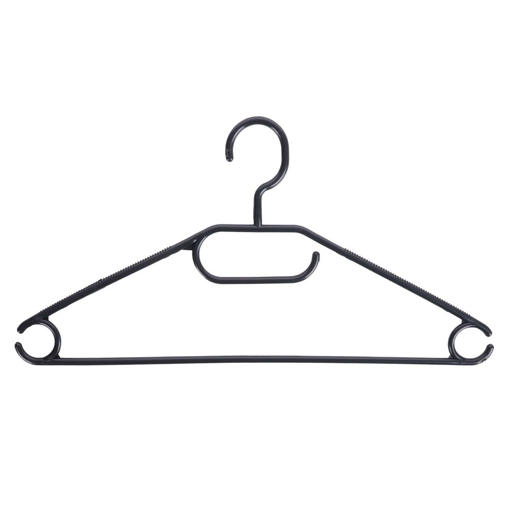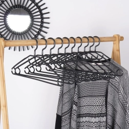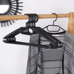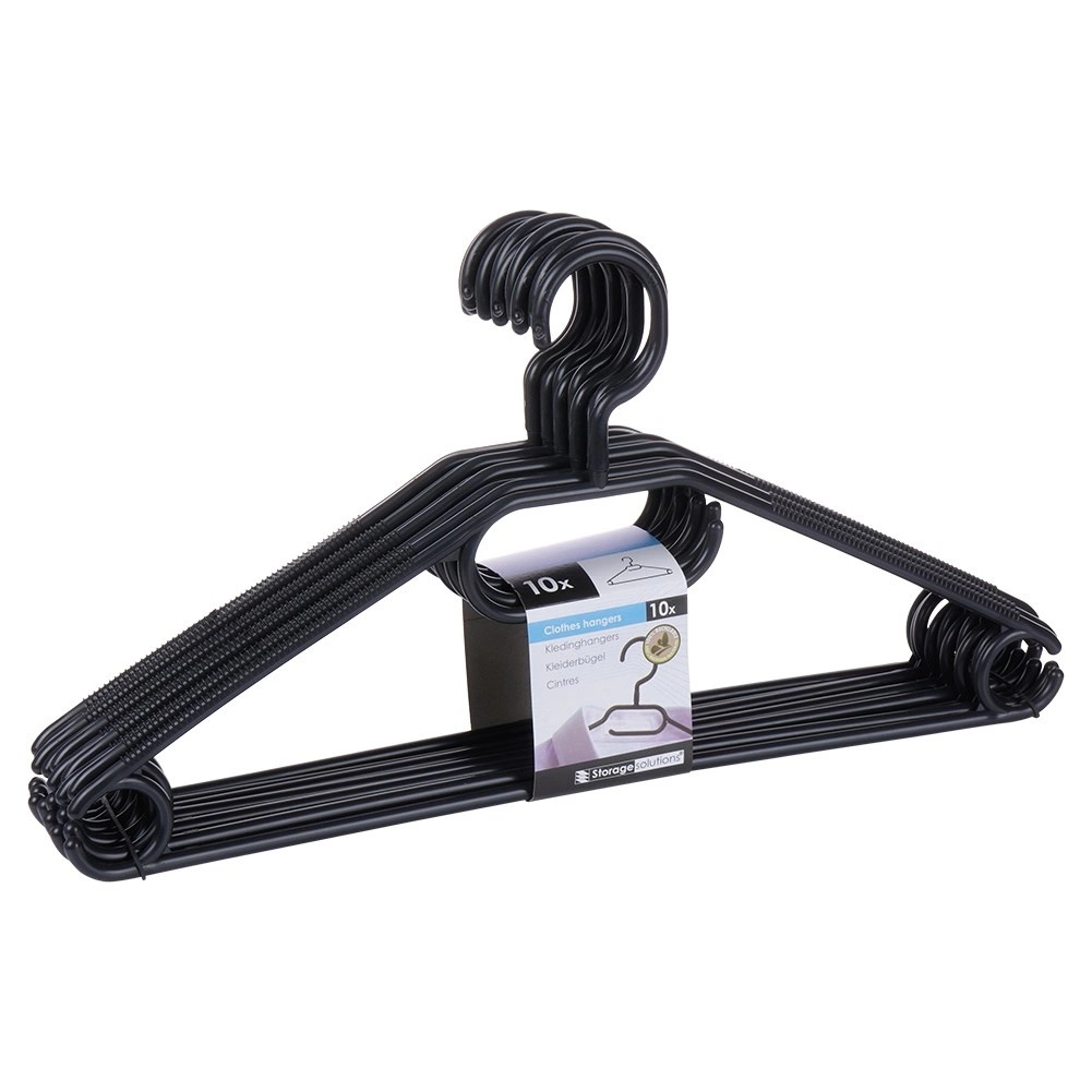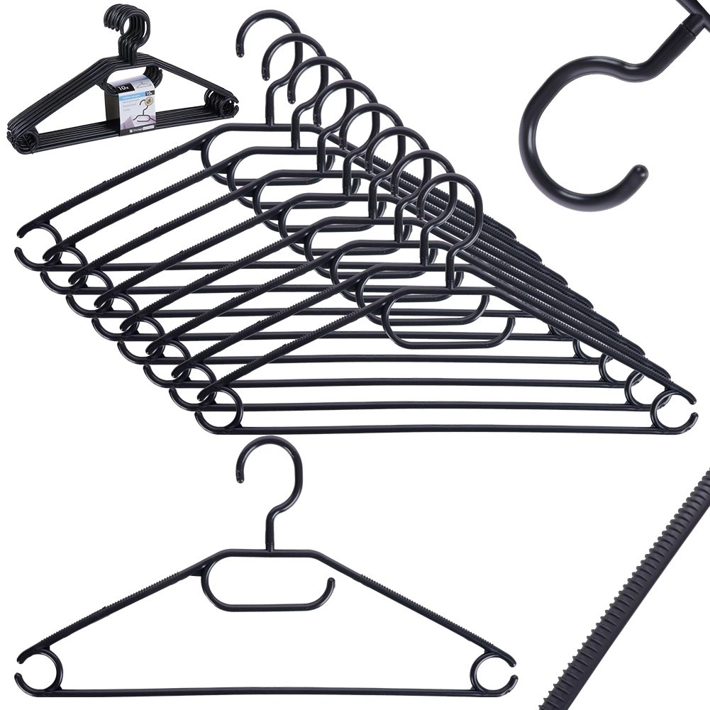 Κρατήστε την ντουλάπα σας τακτοποιημένη με σετ 10 ποιοτικών κρεμαστρών σε κομψό μαύρο χρώμα. Χάρη στον περιστρεφόμενο γάντζο τοποθετούνται εύκολα σε κάθε ντουλάπα, ενώ οι πολλαπλές θέσεις ανάρτησης επιτρέπουν να κρεμάσετε πουκάμισα, σακάκια, φούστες, παντελόνια και αξεσουάρ όπως φουλάρια ή γραβάτες.