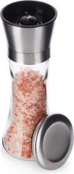 Κομψός χειροκίνητος μύλος για αλάτι, πιπέρι και άλλα μπαχαρικά με ύψος 19 cm, που συνδυάζει διάφανο γυαλί και ανοξείδωτο ατσάλι. Χάρη στον κεραμικό μηχανισμό άλεσης αλέθει αξιόπιστα ακόμα και σκληρούς κόκκους, ενώ με τη συνεχή ρύθμιση της κοκκομετρίας προσαρμόζετε ακριβώς την υφή που χρειάζεστε. Το πρακτικό προστατευτικό καπάκι αποτρέπει τη διαρροή υπολειμμάτων και διατηρεί την κουζίνα καθαρή.