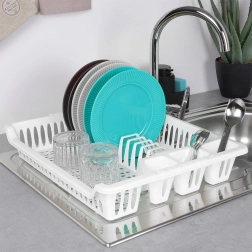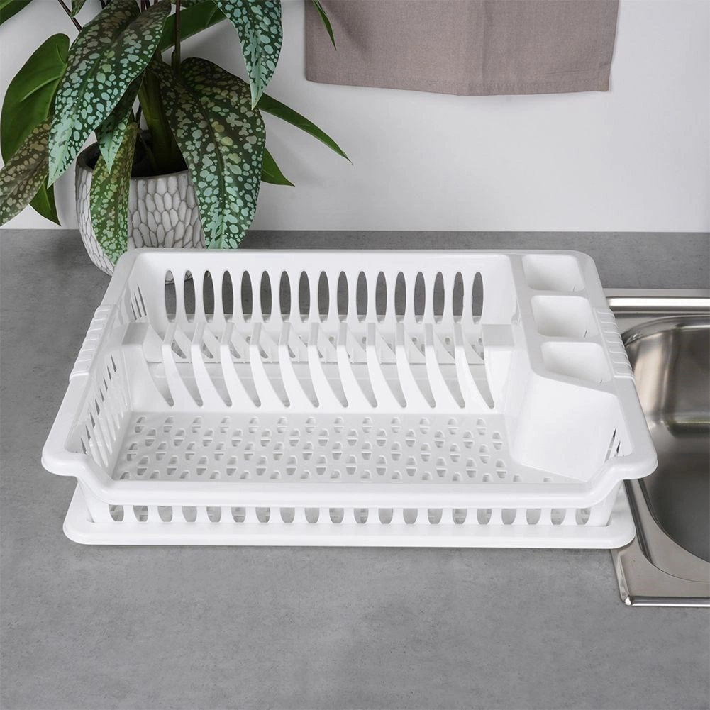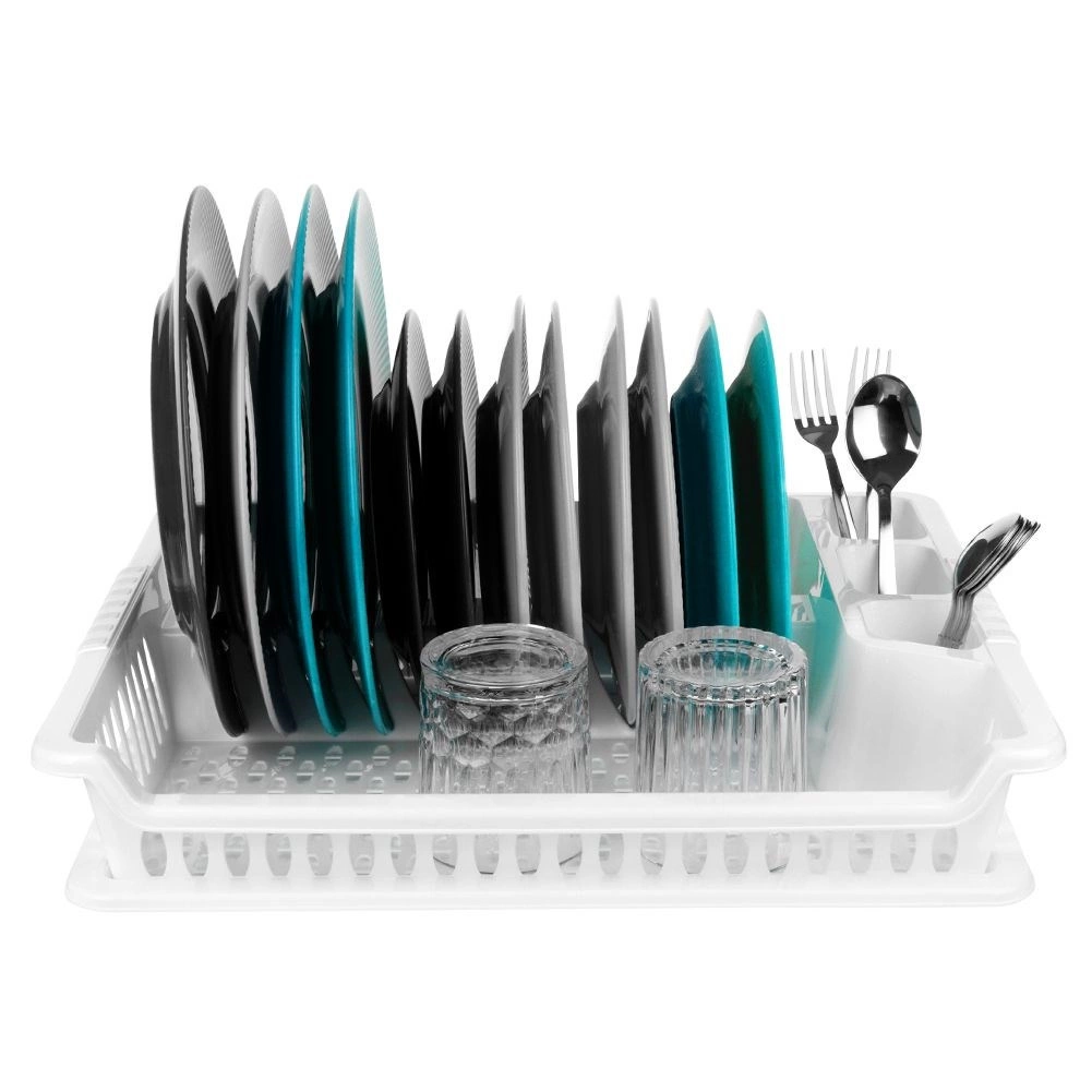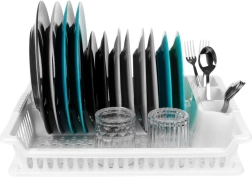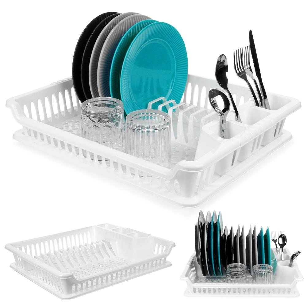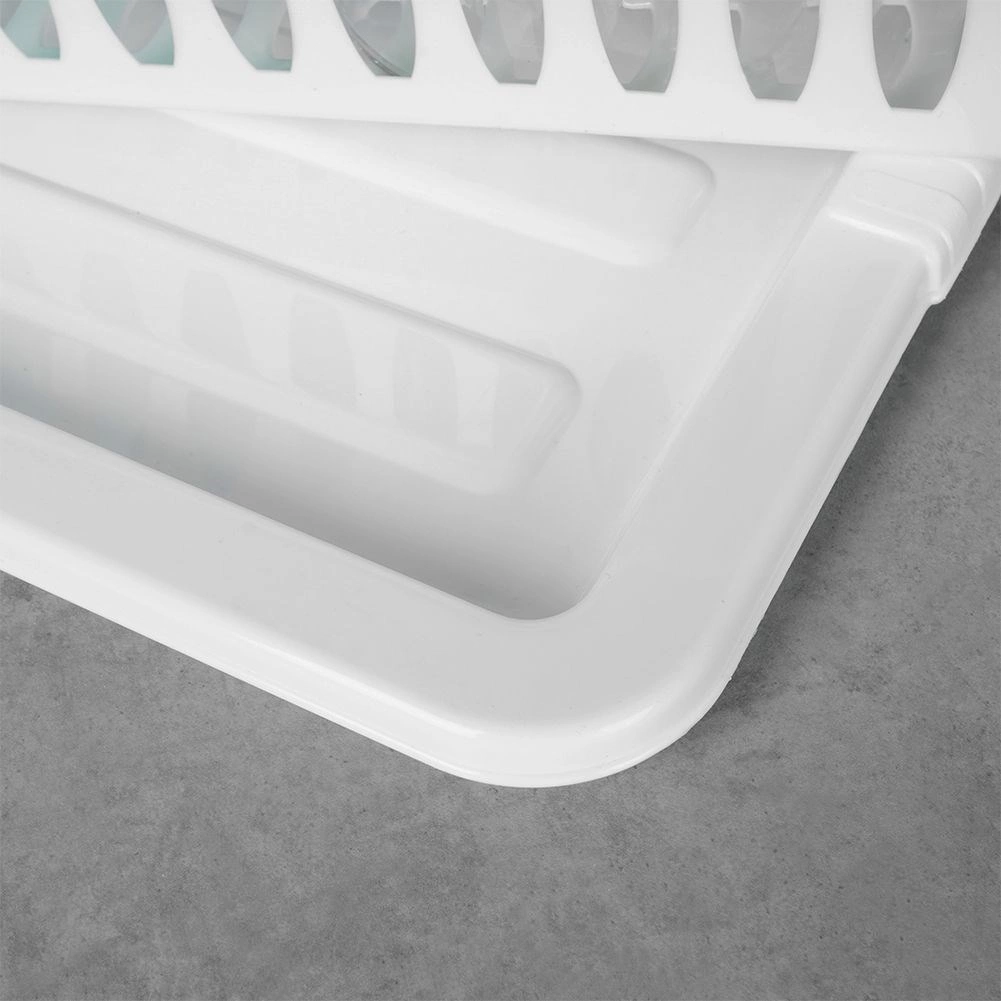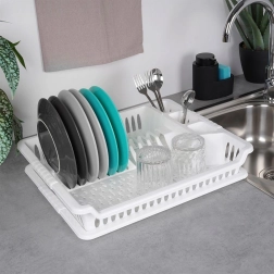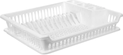 Πρακτική λευκή επιφάνεια αποστράγγισης πιάτων διαστάσεων 46 × 37 × 8,5 cm με αποσπώμενο δισκάκι συλλογής υγρών. Χάρη στις μελετημένες θήκες για πιάτα, ποτήρια και μαχαιροπήρουνα, διατηρεί την κουζίνα σας οργανωμένη και τον πάγκο εργασίας στεγνό. Είναι ελαφριά και ανθεκτική, κατασκευασμένη από ποιοτικό πλαστικό χωρίς BPA, καθαρίζεται εύκολα και είναι ιδανική για το καθημερινό στέγνωμα των σκευών.