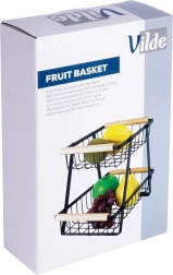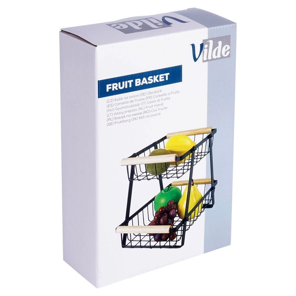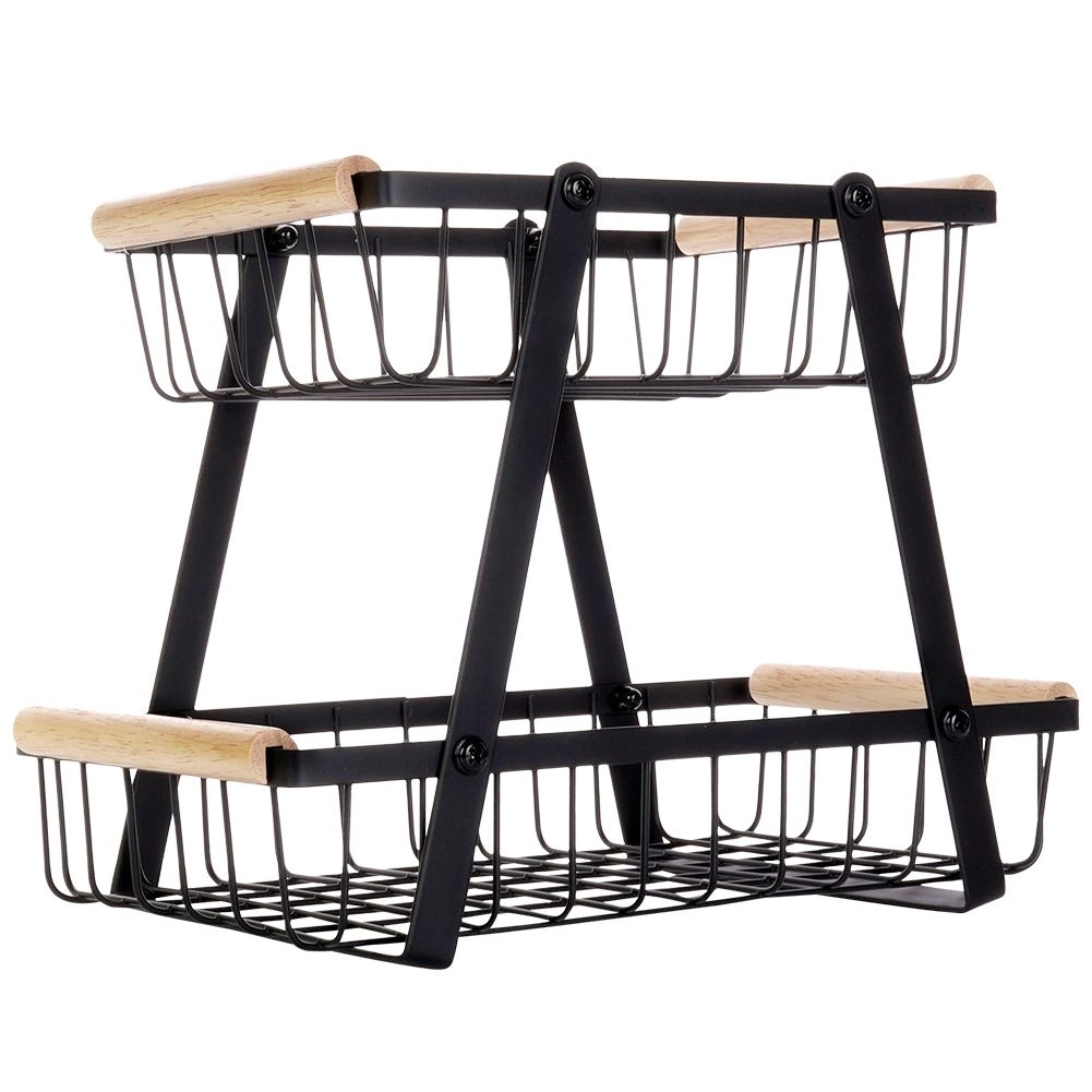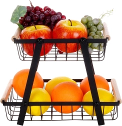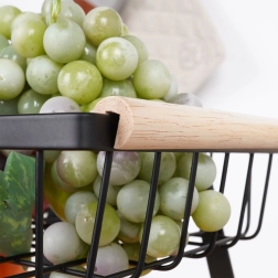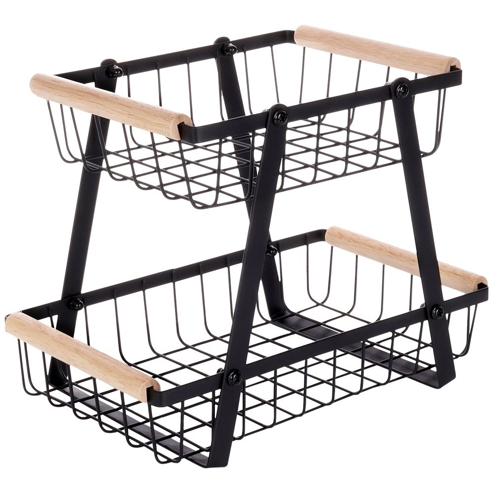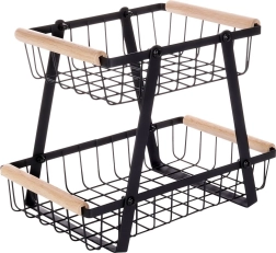 Το καλαθάκι είναι ιδανικό όχι μόνο για τρόφιμα, αλλά και ως πολυλειτουργικός οργανωτής για αρτοσκευάσματα, δοχεία, βαζάκια μπαχαρικών ή γραφικά. Η διώροφη λύση εξοικονομεί χώρο στον πάγκο και διατηρεί τα αντικείμενα τακτοποιημένα. Ο διαχρονικός συνδυασμός ματ μαύρου και ξύλου ταιριάζει σε μοντέρνους και κλασικούς χώρους.