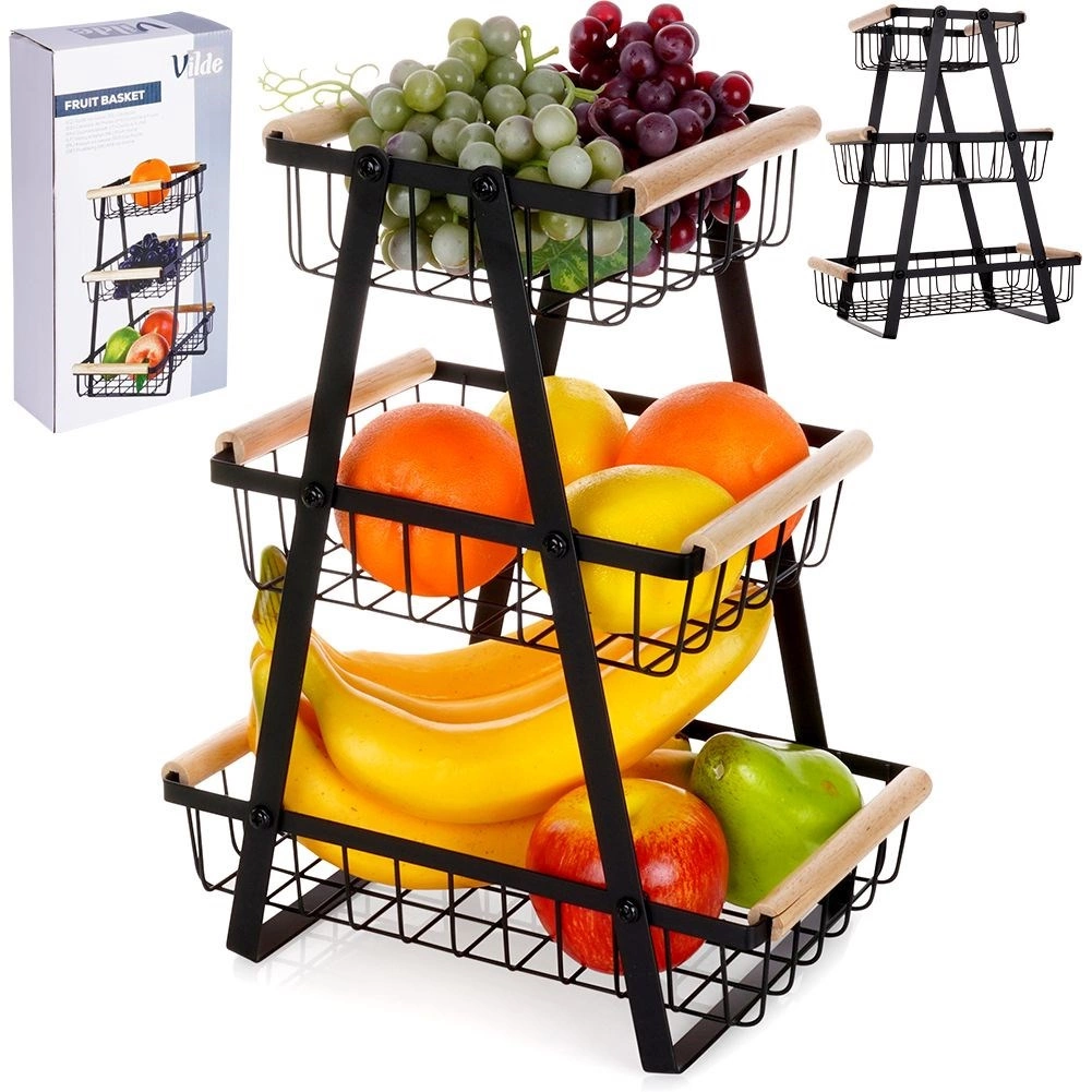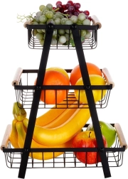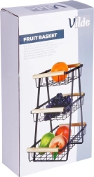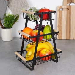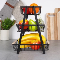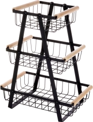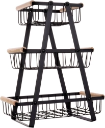 Αυτό το τριώροφο σταντ για φρούτα και λαχανικά προσφέρει έξυπνη κάθετη αποθήκευση, εξοικονομώντας χώρο στον πάγκο και στο ντουλάπι τροφίμων. Τα ανοιχτά καλάθια εξασφαλίζουν καλύτερη ροή αέρα, ώστε τα τρόφιμα να παραμένουν φρέσκα περισσότερο και πάντα ορατά. Το στιβαρό μέταλλο σε ματ μαύρο συμπληρώνεται από ευχάριστες ξύλινες χειρολαβές για άνετο χειρισμό.