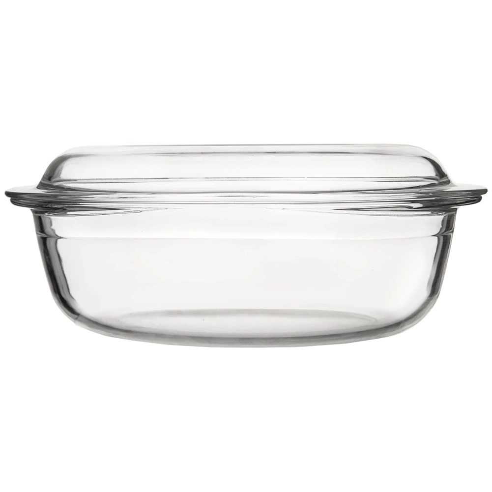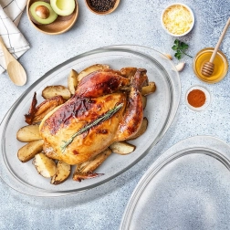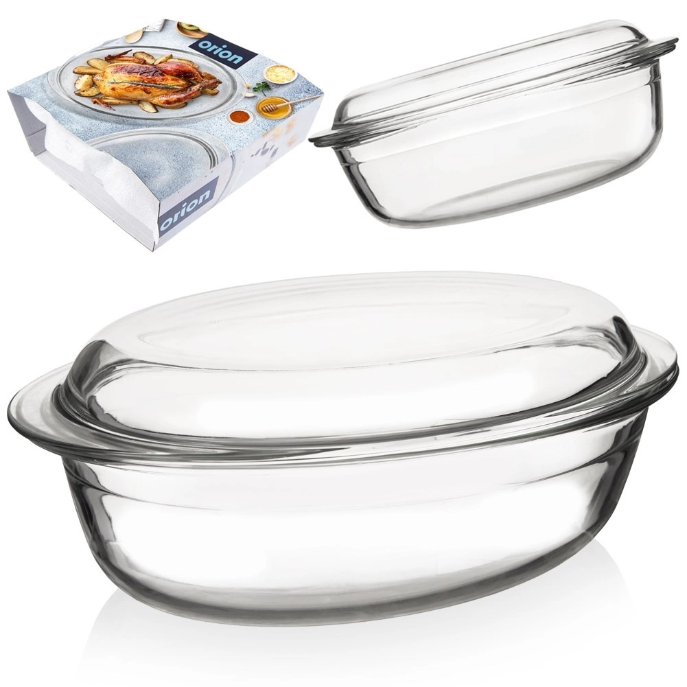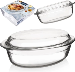 Κυριαρχήστε στο οικιακό ψήσιμο με την οβάλ γυάλινη γάστρα με καπάκι χωρητικότητας 3 l. Κατασκευασμένη από βοριοπυριτικό γυαλί, ανθεκτική από -20 °C έως +300 °C, κατάλληλη για φούρνο και φούρνο μικροκυμάτων, με εύκολο καθάρισμα στο πλυντήριο πιάτων. Τα δύο μέρη μπορούν να χρησιμοποιηθούν ξεχωριστά ή μαζί – το καπάκι λειτουργεί ως δεύτερο ταψί.