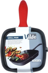 Τετράγωνο μαντεμένιο τηγάνι γκριλ με πρακτική κόκκινη σιλικονούχα θήκη λαβής για ασφαλή μεταφορά. Προσφέρει γρήγορη και ομοιόμορφη θέρμανση, υψηλή συσσώρευση θερμότητας και ραβδωτή επιφάνεια για αυθεντικά σημάδια γκριλ και απορροή λίπους. Κατάλληλο για αέριο, ηλεκτρικό, κεραμικό, αλογόνου και επαγωγικό, για φούρνο καθώς και για ανοιχτή φωτιά ή ψησταριά.