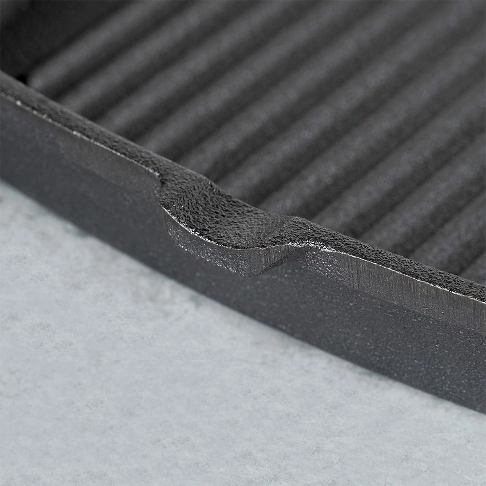 Οι ψηλότερες ραβδώσεις δημιουργούν έντονες γραμμές γκριλ και απομακρύνουν το λίπος. Τα ενσωματωμένα ραμφάκια διευκολύνουν το σούρωμα ζουμιών και λιπών.