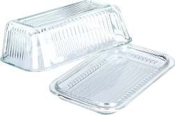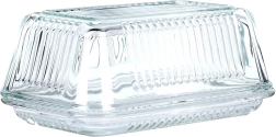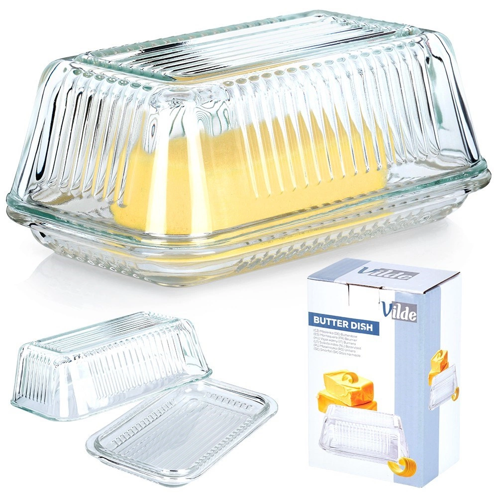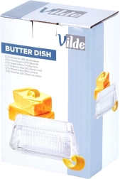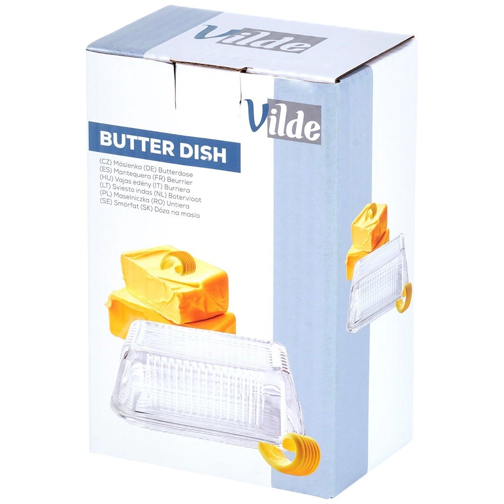 Η γυάλινη βουτυριέρα Vilde είναι ένα στιλάτο και πρακτικό αξεσουάρ για κάθε κουζίνα. Το διάφανο, ποιοτικό γυαλί με διακοσμητικές ρίγες τονίζει την κομψή εμφάνιση και παράλληλα διευκολύνει το κράτημα. Το κλασικό ορθογώνιο σχήμα ταιριάζει άψογα με κάθε σερβίτσιο και επιτρέπει άνετο σερβίρισμα του βουτύρου στο τραπέζι αλλά και τακτοποιημένη αποθήκευση στο ψυγείο.