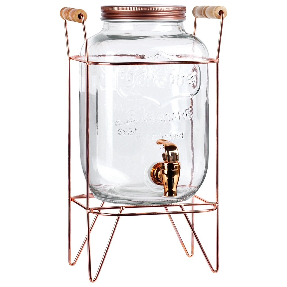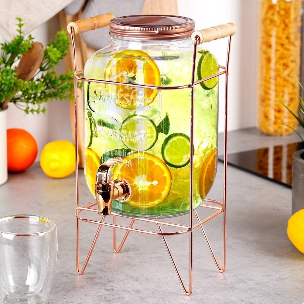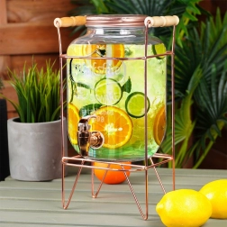 Κομψός γυάλινος διανεμητής ποτών χωρητικότητας 4,2 l με σταθερή βάση σε απόχρωση ροζ χρυσού και πρακτική βρύση για εύκολο σερβίρισμα. Ιδανικός για λεμονάδες, ποντς, αρωματισμένο νερό και παγωμένα τσάγια σε πάρτι, ψησίματα και οικογενειακές συγκεντρώσεις. Το φαρδύ στόμιο διευκολύνει την προσθήκη πάγου και φρούτων, ενώ το βιδωτό καπάκι προστατεύει το ποτό από έντομα.