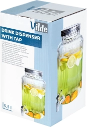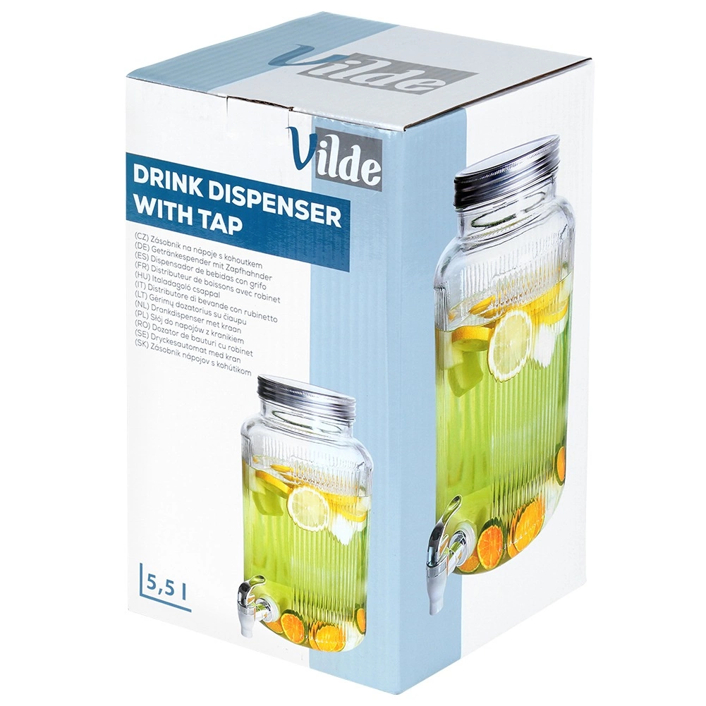 Ο γυάλινος διανεμητής μεγάλης χωρητικότητας με βρυσάκι διευκολύνει το σερβίρισμα ποτών σε κάθε περίσταση. Το φαρδύ στόμιο εξασφαλίζει άνετο γέμισμα και καθαρισμό, το διάφανο σώμα επιτρέπει έλεγχο του περιεχομένου και το μεταλλικό καπάκι προστατεύει αξιόπιστα το ποτό από έντομα. Ιδανικός για νερό με εσπεριδοειδή, σπιτική λεμονάδα, χυμούς, σανγκρία ή παντς (όχι για ζεστά ροφήματα).
