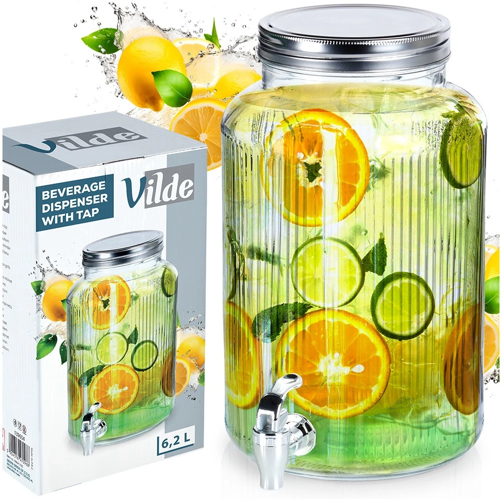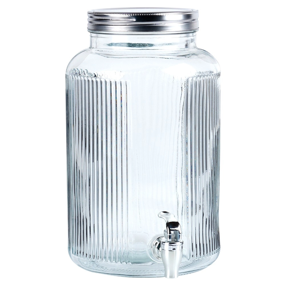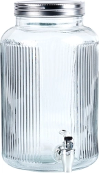 Κομψός γυάλινος διανεμητής ποτών χωρητικότητας 6,2 l με πρακτικό βρυσάκι και βιδωτό καπάκι, που συνδυάζει στιλ και λειτουργικότητα για το σερβίρισμα λεμονάδας, νερού με φρούτα ή παγωμένου τσαγιού. Ανθεκτικό παχύ γυαλί με ραβδωτό σχέδιο, ασφαλές για επαφή με τρόφιμα, που δείχνει υπέροχο σε πάρτι κήπου ή στο σπίτι.