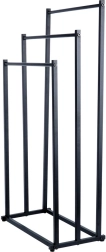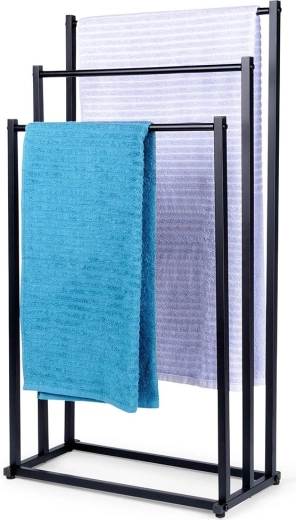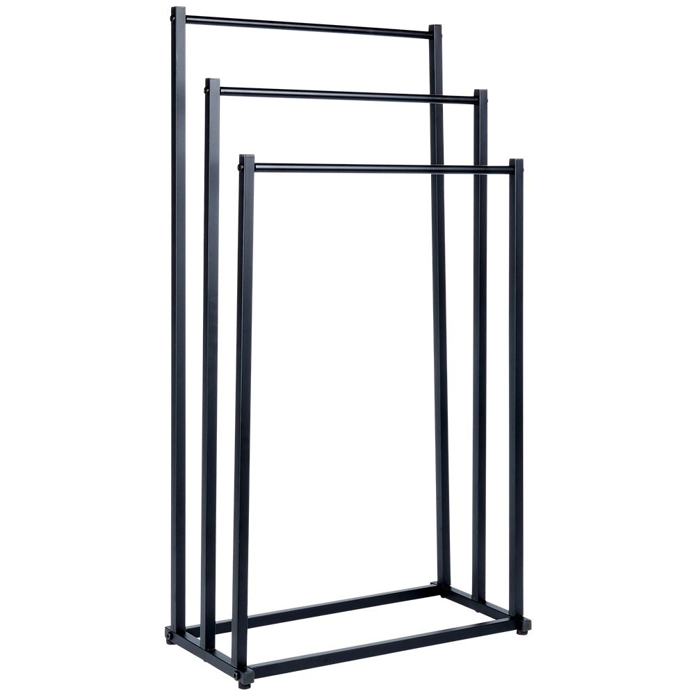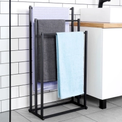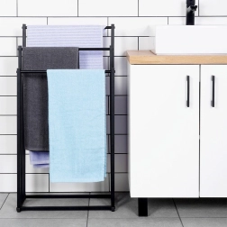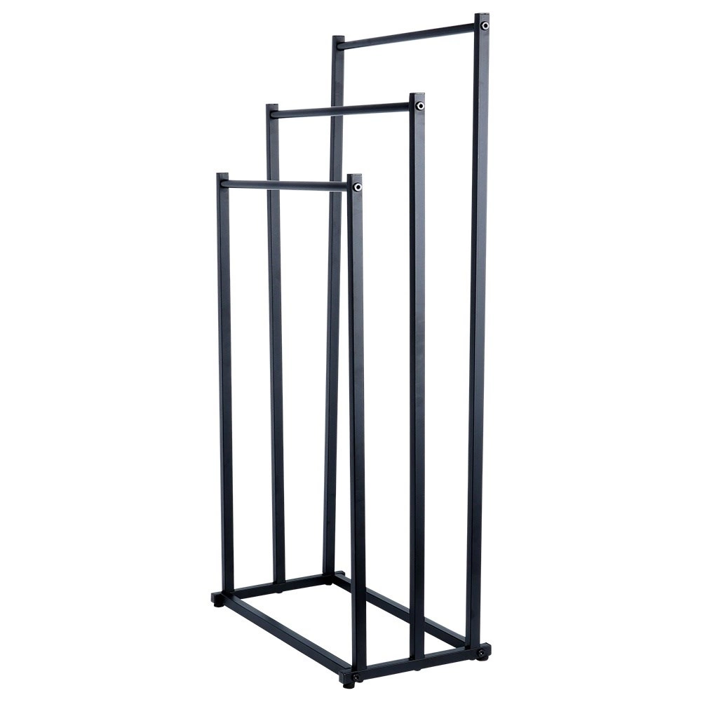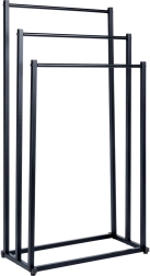 Πρακτική ελεύθερη επιδαπέδια κρεμάστρα για πετσέτες ή ρούχα με τρεις βαθμιδωτά διατεταγμένες ράβδους που εξασφαλίζουν τακτική αποθήκευση και καλύτερη κυκλοφορία αέρα για ταχύτερο στέγνωμα. Το μινιμαλιστικό look σε ματ μαύρο ταιριάζει ιδανικά σε μοντέρνους χώρους και χαρίζει βιομηχανικό χαρακτήρα στο μπάνιο.
