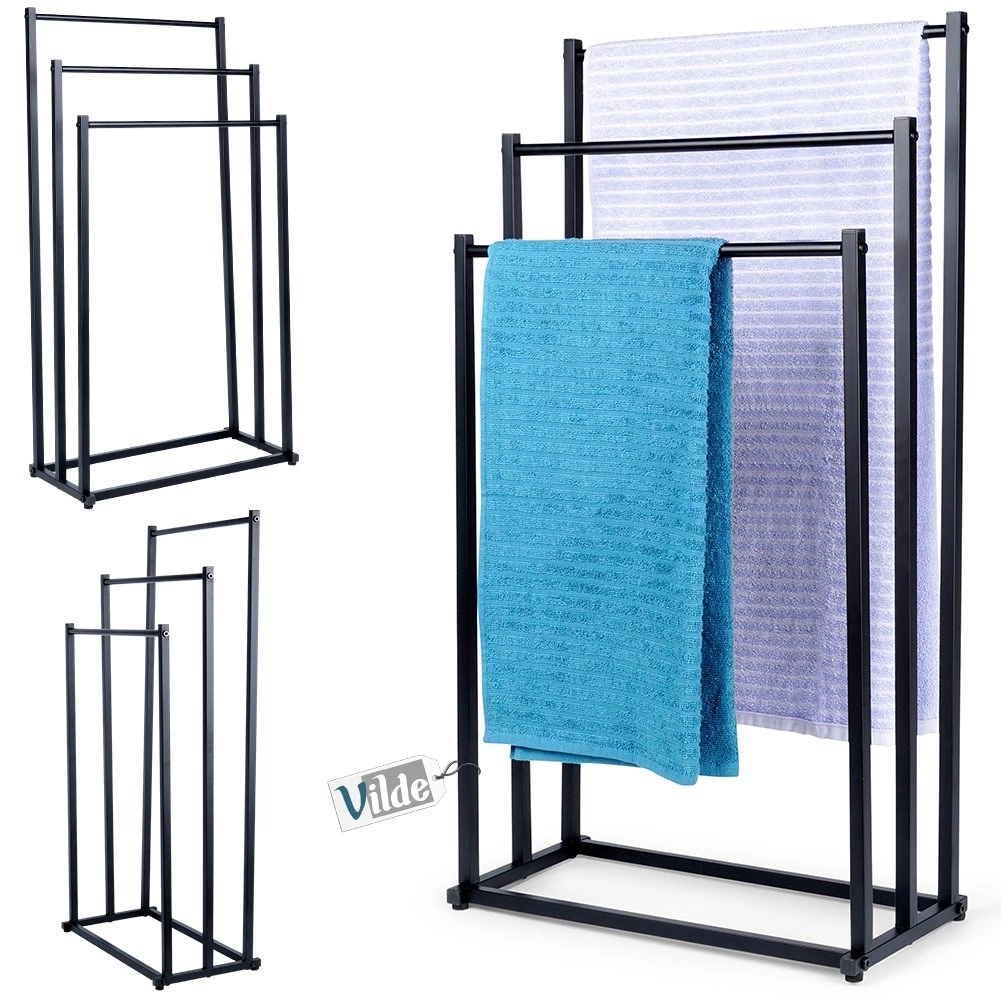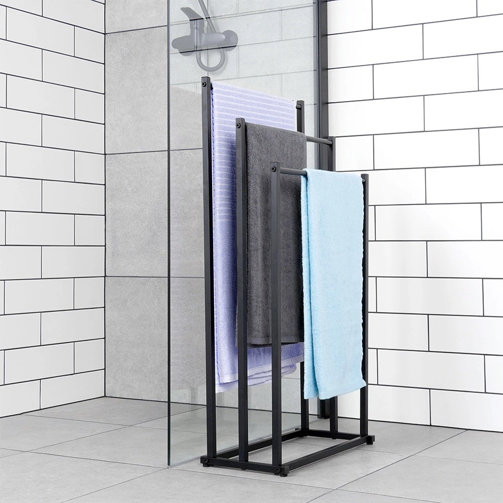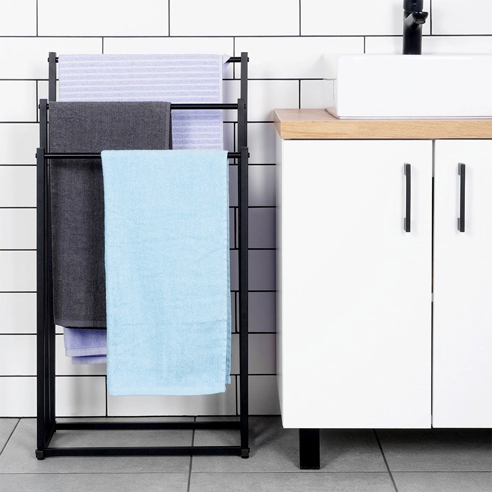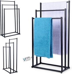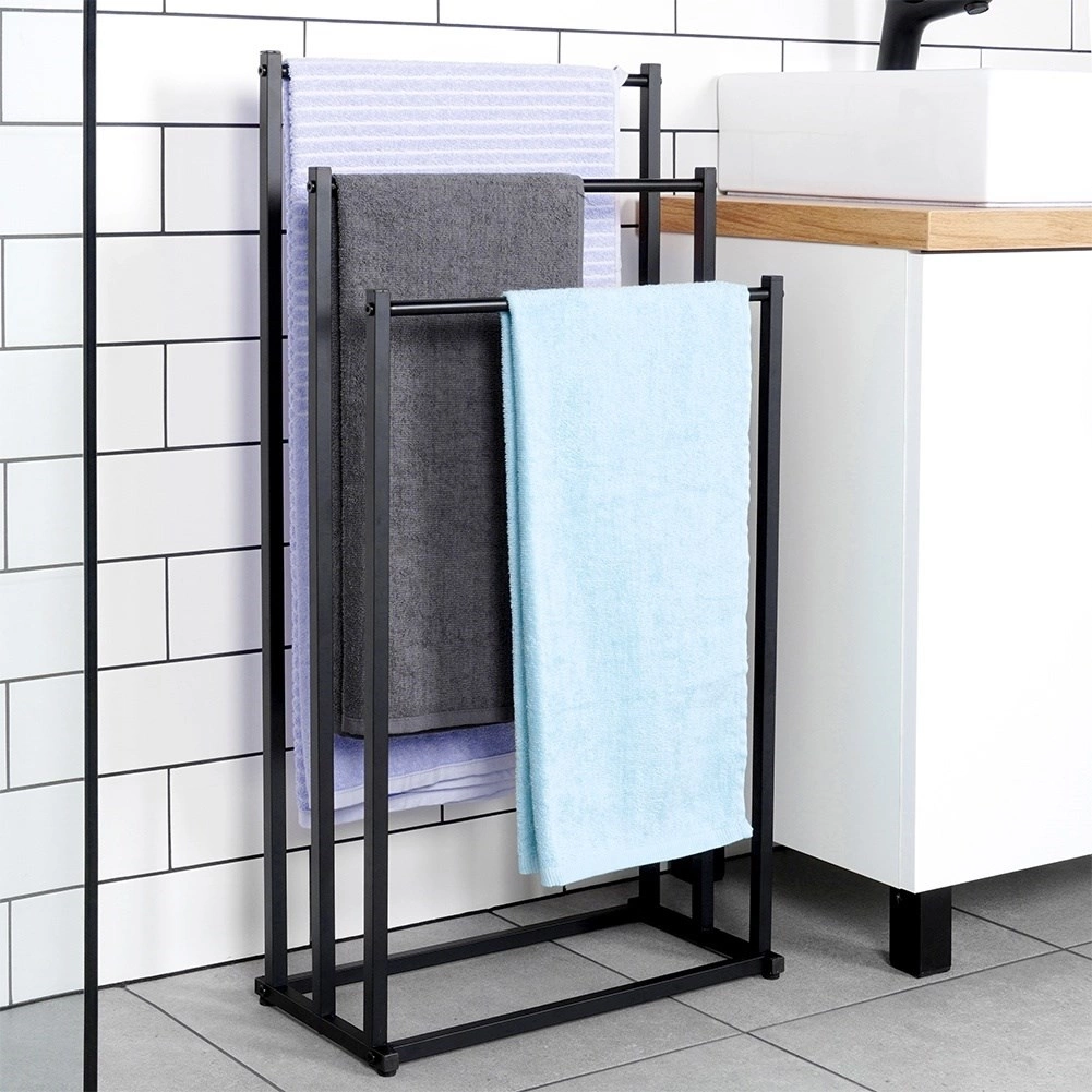 Κομψή επιδαπέδια κρεμάστρα πετσετών με τριπλές βαθμιδωτές ράβδους, που προσφέρει γρήγορο στέγνωμα, εξοικονόμηση χώρου και σταθερή μεταλλική κατασκευή με ηλεκτροστατική βαφή σε μαύρο χρώμα. Ιδανική για μοντέρνα και κλασική μπάνια, εύκολη συναρμολόγηση και στυλάτος loft σχεδιασμός.