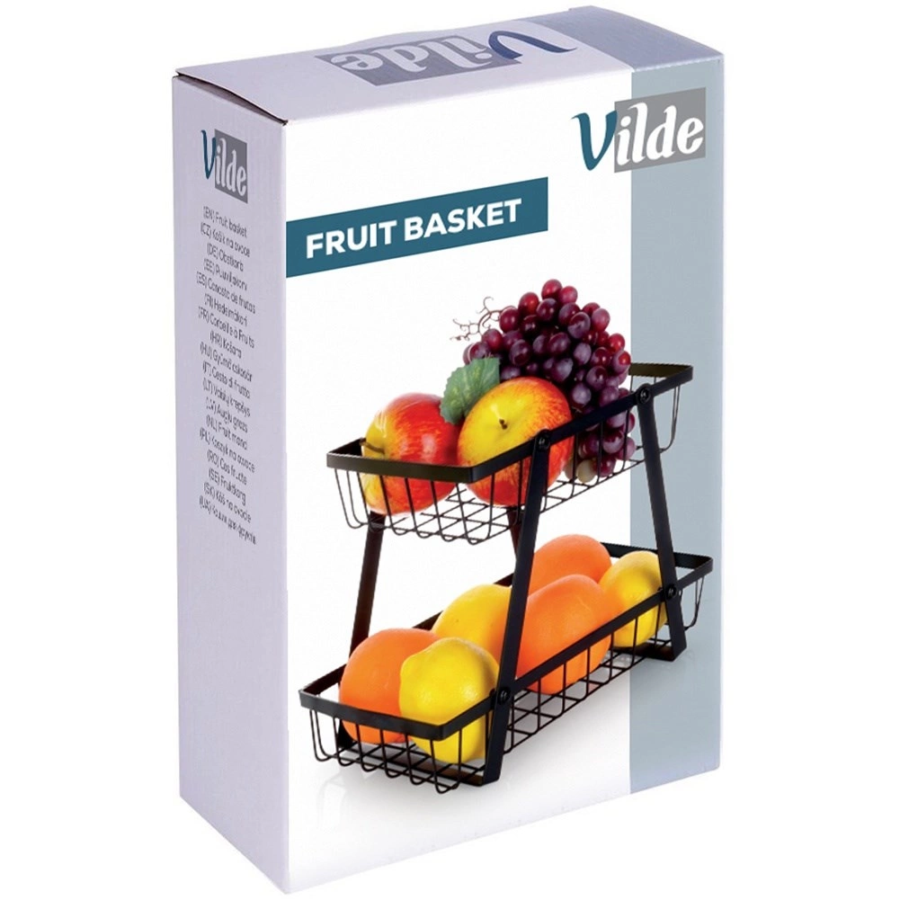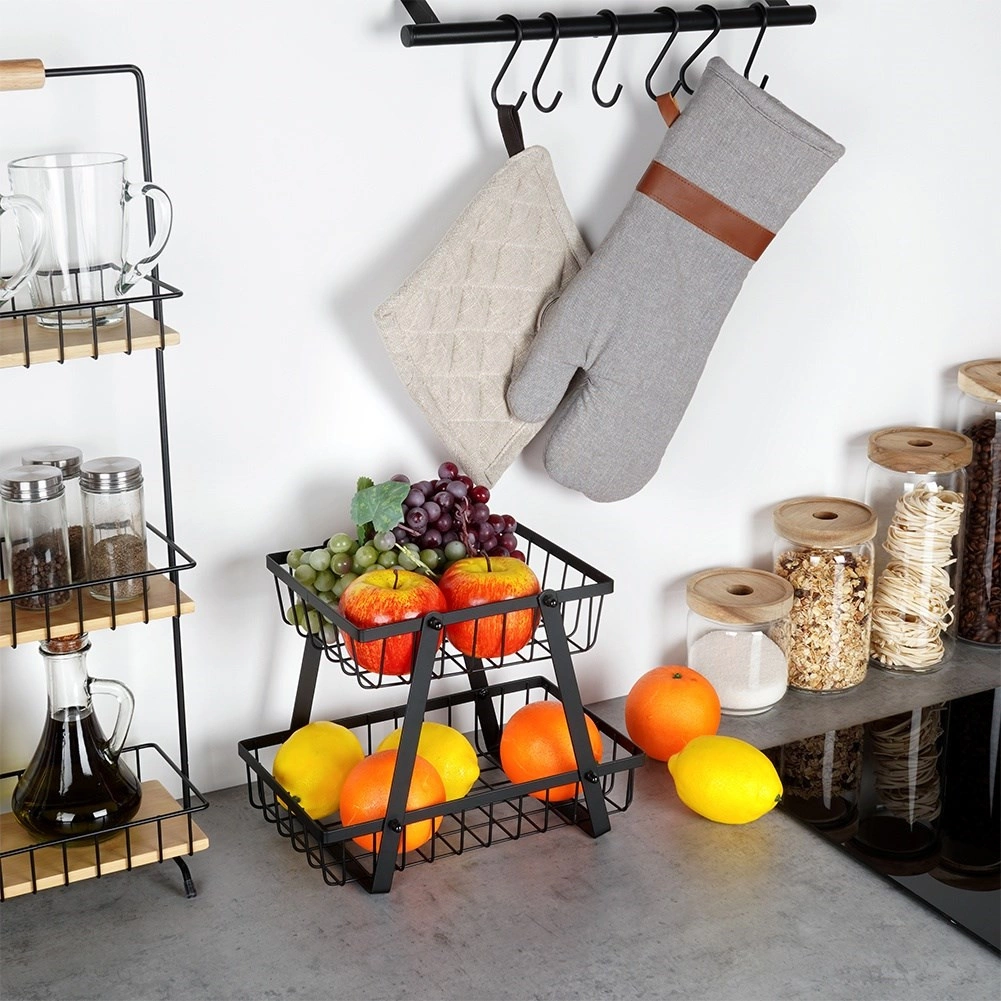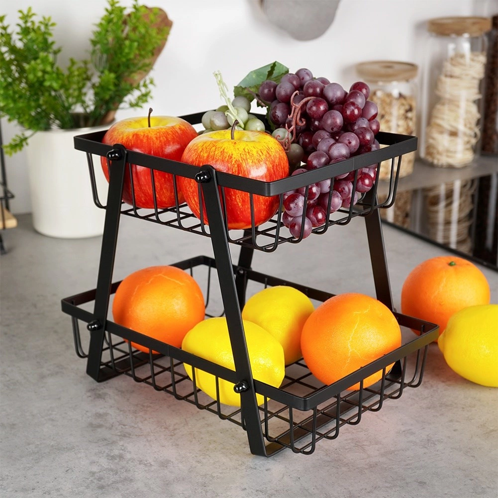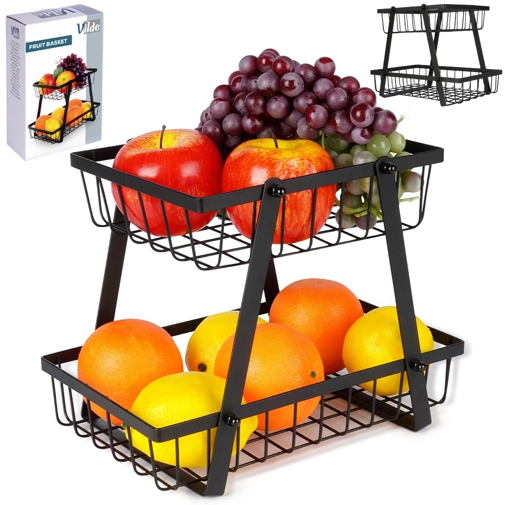 Στιλάτος και πρακτικός βοηθός για κάθε κουζίνα: ο διώροφος μεταλλικός στάντ με συρμάτινα καλάθια σε βιομηχανικό loft στυλ εξοικονομεί χώρο και ταυτόχρονα αναδεικνύει όμορφα τα φρούτα και τα λαχανικά σας. Τα ανοικτά τοιχώματα ενισχύουν την κυκλοφορία αέρα, ώστε τα προϊόντα να παραμένουν περισσότερο φρέσκα και ορατά.
