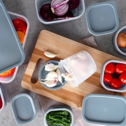 Τα δοχεία είναι κατασκευασμένα από ανθεκτικό και ασφαλές για τρόφιμα πλαστικό σε διάφανο φινίρισμα με γκρι καπάκια. Ιδανικά για ξηρές πρώτες ύλες, αλλαντικά, σαλάτες, φρούτα, λαχανικά, έτοιμα γεύματα και σνακ, αλλά και για μικρά κουζινικά. Εύκολη συντήρηση – κατάλληλα για πλυντήριο πιάτων, ασφαλή για κατάψυξη και ψυγείο.