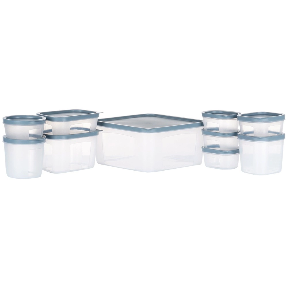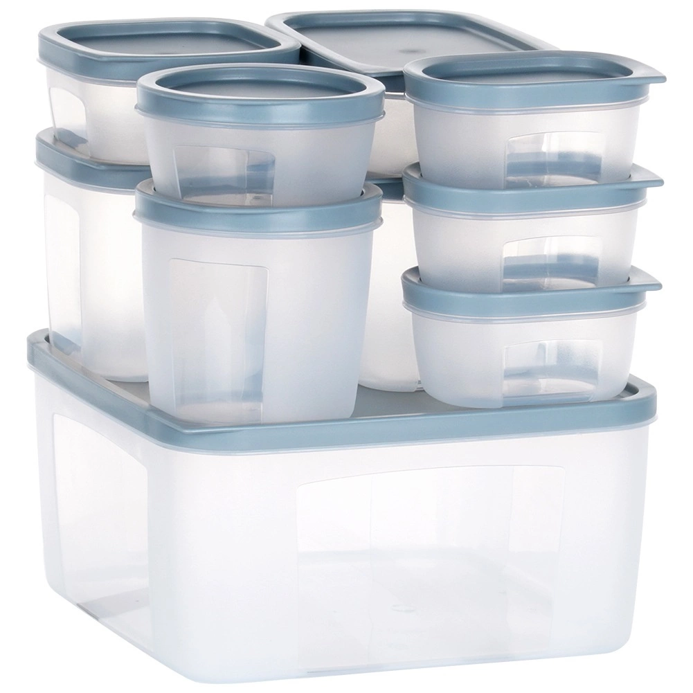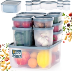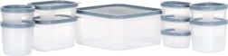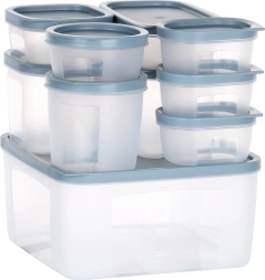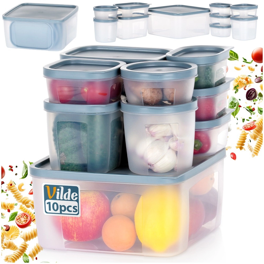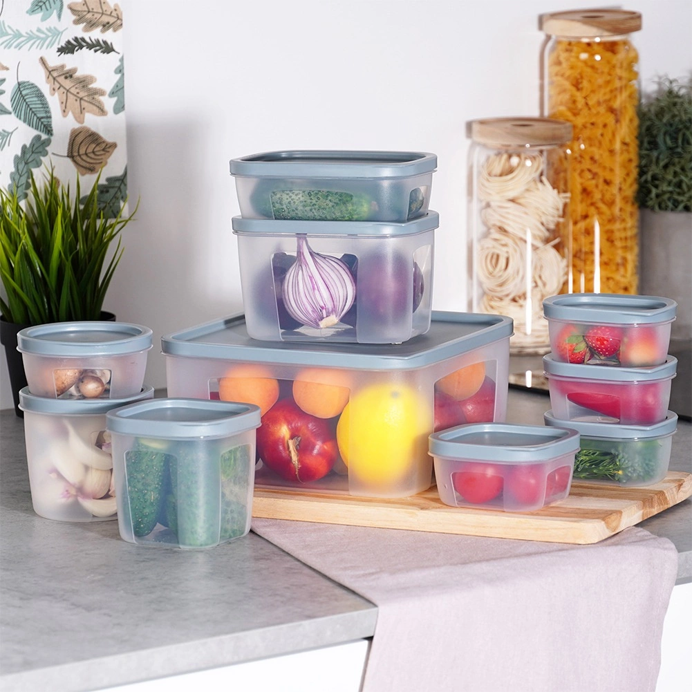 Πρακτικό σετ 10 δοχείων τροφίμων με γκρι καπάκια για οργανωμένη και υγιεινή αποθήκευση στην κουζίνα. Ποικίλα μεγέθη για φρούτα, λαχανικά, σνακ και ξηρά τρόφιμα, τα δοχεία είναι αεροστεγή, στοιβαζόμενα και κατάλληλα για ψυγείο, κατάψυξη και πλυντήριο πιάτων.
