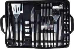 Περιεχόμενα σετ: 1× σπάτουλα (35 cm), 1× λαβίδα (34,5 cm), 1× πιρούνα (35 cm), 1× μαχαίρι (32 cm), 1× πινέλο με σιλικονούχες τρίχες (34 cm), 8× σουβλί (35 cm), 1× αλατιέρα (3,5 × 5,5 cm), 1× πιπεριέρα (3,5 × 5,5 cm), 1× βούρτσα για γκριλ με ξύστρα (34 cm) + 1× ανταλλακτική κεφαλή, 8× στηρίγματα καλαμποκιού (7 cm), 4× πιρούνια φαγητού (21 cm), 4× μαχαίρια φαγητού (24 cm), 1× θήκη.