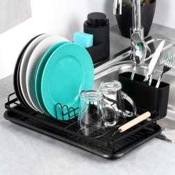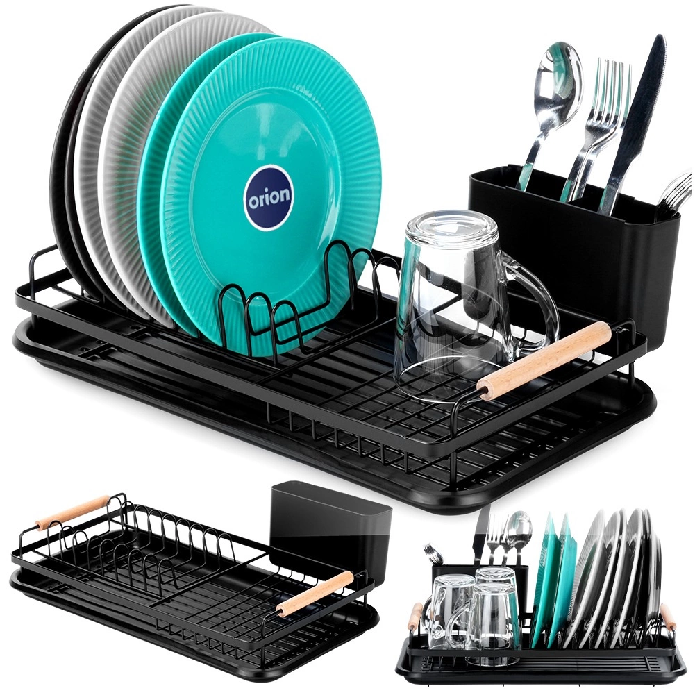 Κομψή και συμπαγής στραγγίστρα πιάτων με διαστάσεις 43 × 23,5 × 9,5 cm, προσφέρει χώρο για πιάτα, ποτήρια και μαχαιροπίρουνα. Διαθέτει αφαιρούμενο δίσκο συλλογής νερού, αποσπώμενη θήκη μαχαιροπίρουνων και ξύλινες λαβές για εύκολη μεταφορά. Η ανθεκτική μεταλλική κατασκευή σε ματ μαύρο προστατεύει τον πάγκο από το νερό και διατηρεί την κουζίνα τακτοποιημένη.
