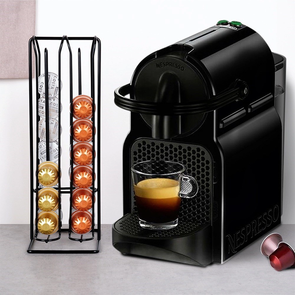 Κομψή και σταθερή βάση για κάψουλες συμβατή με NESPRESSO, χωρά έως 32 κάψουλες σε τέσσερις σειρές. Διαθέτει συμπαγείς διαστάσεις 12,5 × 10 × 30 cm, είναι κατασκευασμένη από ποιοτικό μαύρο μέταλλο και χάρη στην πρακτική κατασκευή εξασφαλίζει γρήγορη πρόσβαση στις αγαπημένες γεύσεις, εξοικονόμηση χώρου στον πάγκο της κουζίνας και στιλάτη εμφάνιση στην κουζίνα σας.