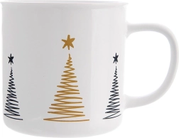 Στιλάτη κεραμική κούπα χωρητικότητας 500 ml με μίνιμαλ χριστουγεννιάτικα δεντράκια σε μαύρο και χρυσό. Χάρη στο πρακτικό χερούλι κρατιέται άνετα, είναι κατάλληλη για πλυντήριο πιάτων και φούρνο μικροκυμάτων και ιδανική για καφέ, τσάι ή κακάο.