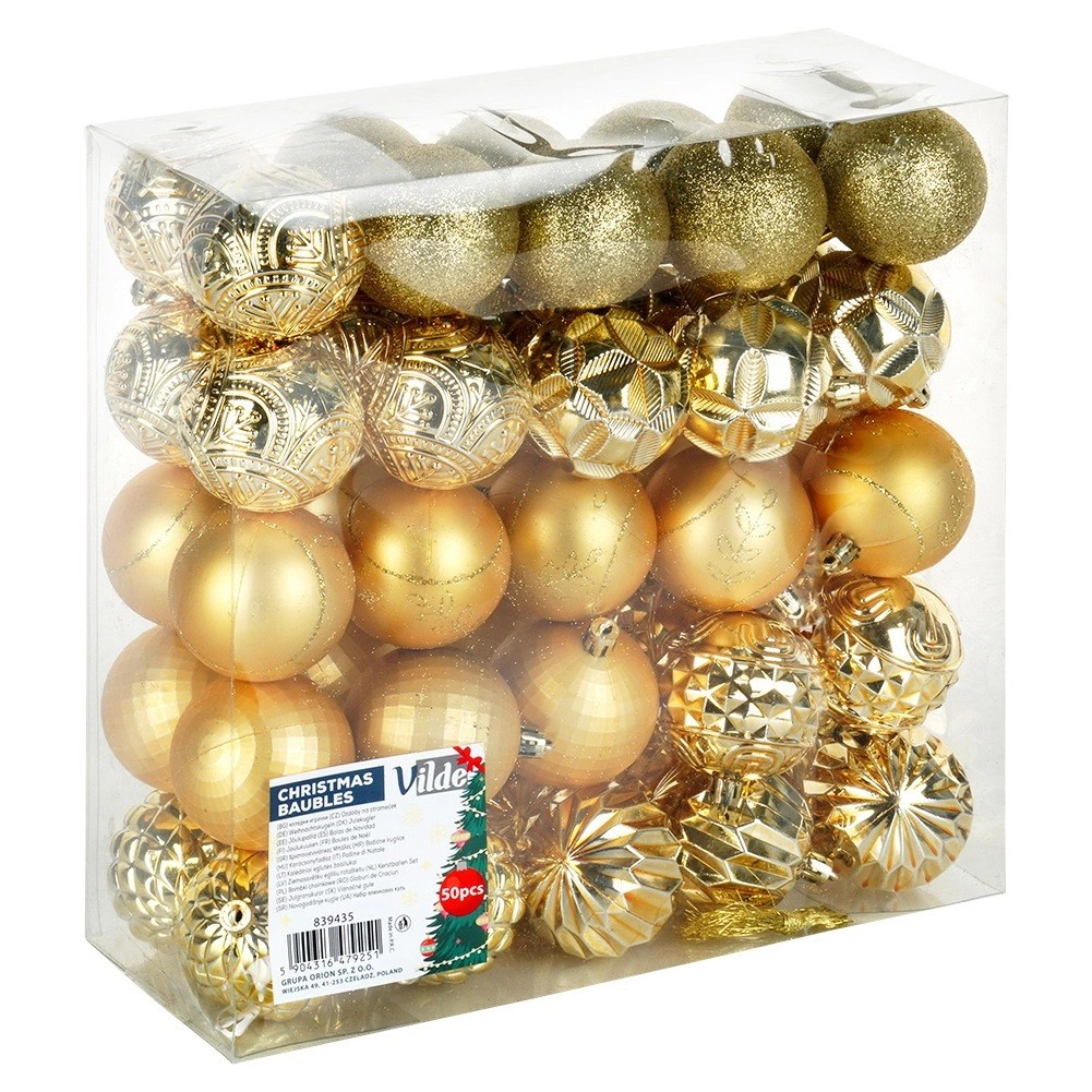 Δημιουργήστε μαγευτική χριστουγεννιάτικη διακόσμηση με το πλούσιο σετ 50 τεμαχίων σε ενιαίο χρυσό τόνο. Τα στολίδια αποπνέουν πολυτέλεια και, χάρη στις διαφορετικές υφές και διακοσμήσεις, χαρίζουν στο δέντρο και στις συνθέσεις βάθος και λάμψη. Είναι κατασκευασμένα από ανθεκτικό υλικό που θυμίζει γυαλί, αλλά είναι πιο ασφαλές και πιο ανθεκτικό.