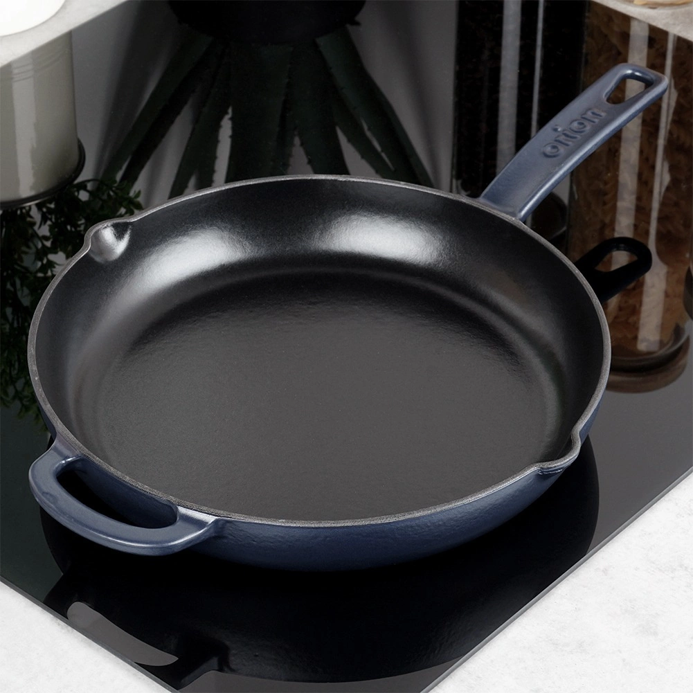 Ανθεκτικό χυτοσιδηρό τηγάνι διαμέτρου 28 cm με μαύρο σμάλτο εσωτερικά και μπλε εξωτερικά, προσφέρει ομοιόμορφη κατανομή θερμότητας, μακρά διατήρηση θερμότητας και ευρεία συμβατότητα με όλους τους τύπους εστιών, συμπεριλαμβανομένης της επαγωγικής. Χάρη στις δύο στόμιες χύσης και τη διπλή λαβή είναι ιδανικό για τηγάνισμα, ψήσιμο και σερβίρισμα κατευθείαν στο τραπέζι.