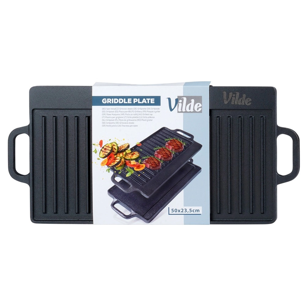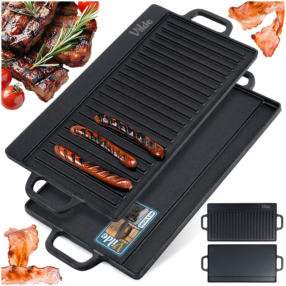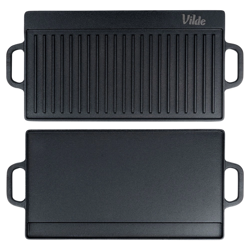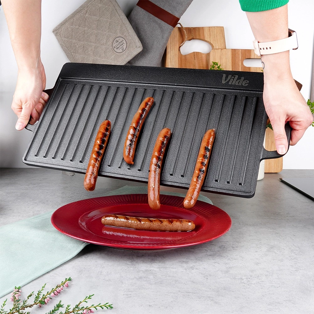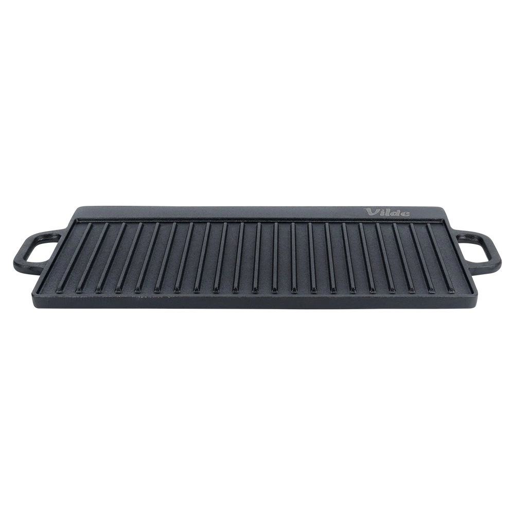 Ανακαλύψτε την ευελιξία της χυτοσιδηρής πλάκας CAST LINE: η μία πλευρά είναι λεία για κρέπες, αυγά ή θαλασσινά, η άλλη ραβδωτή για έντονες γραμμές ψησίματος σε steaks, λαχανικά και λουκάνικα. Ο στιβαρός χυτοσίδηρος εξασφαλίζει εξαιρετική συσσώρευση θερμότητας και ομοιόμορφη θέρμανση σε όλη την επιφάνεια, προσφέροντας ζουμερά αποτελέσματα με ελάχιστο κάψιμο.