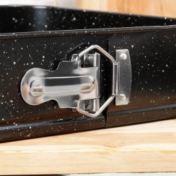 Η μεταλλική πόρπη απελευθερώνει το πλαϊνό τοίχωμα και μαζί με τον αποσπώμενο πάτο επιτρέπει να αφαιρέσετε τη φόρμα χωρίς να τραυματίσετε το γλυκό.