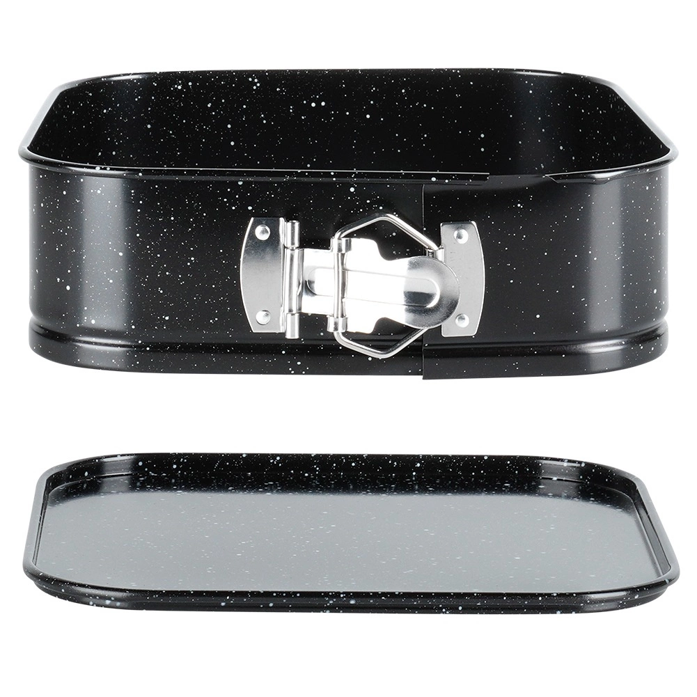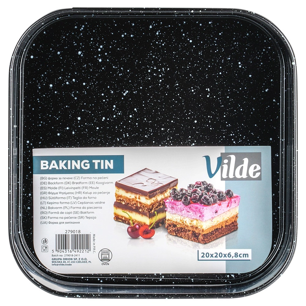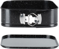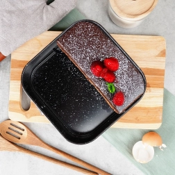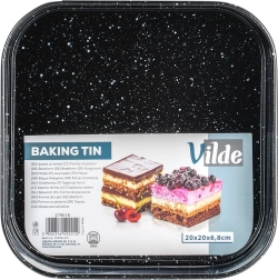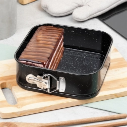 Η τετράγωνη φόρμα διαστάσεων 20 × 20 × 6,8 cm είναι εξαιρετική επιλογή για καθημερινό ψήσιμο. Ο στιβαρός ανθρακοχάλυβας εξασφαλίζει σταθερότητα και ομοιόμορφη κατανομή θερμότητας, ενώ η γρανιτένια επίστρωση περιορίζει την πρόσφυση ακόμα και με μικρή ποσότητα λιπαρών. Χάρη στο αποσπώμενο στεφάνι και τον αποσπώμενο πάτο αφαιρείτε το έτοιμο γλυκό χωρίς να χαλάσει το σχήμα.
