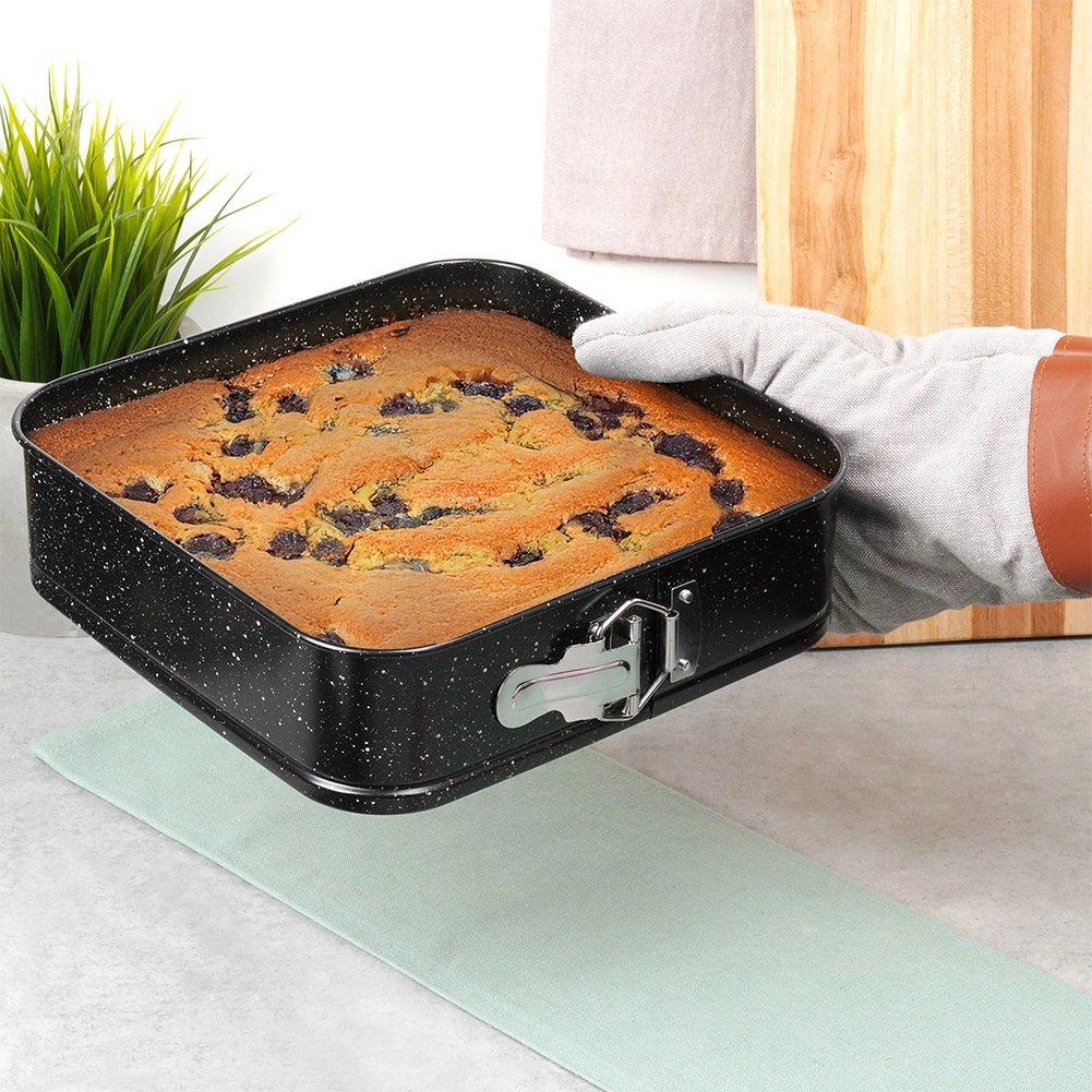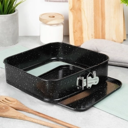 Η τετράγωνη αποσπώμενη φόρμα διαστάσεων 24 × 24 × 6,8 cm είναι μια αξιόπιστη επιλογή για καθημερινό ψήσιμο. Χάρη στα αποσπώμενα πλαϊνά και τον αφαιρούμενο πάτο αφαιρείτε το ψημένο μείγμα χωρίς να χαλάει το σχήμα και με ελάχιστη προσπάθεια. Η αντικολλητική γρανιτένια στρώση μειώνει την ανάγκη για λίπος και κάνει τον καθαρισμό ευκολότερο.