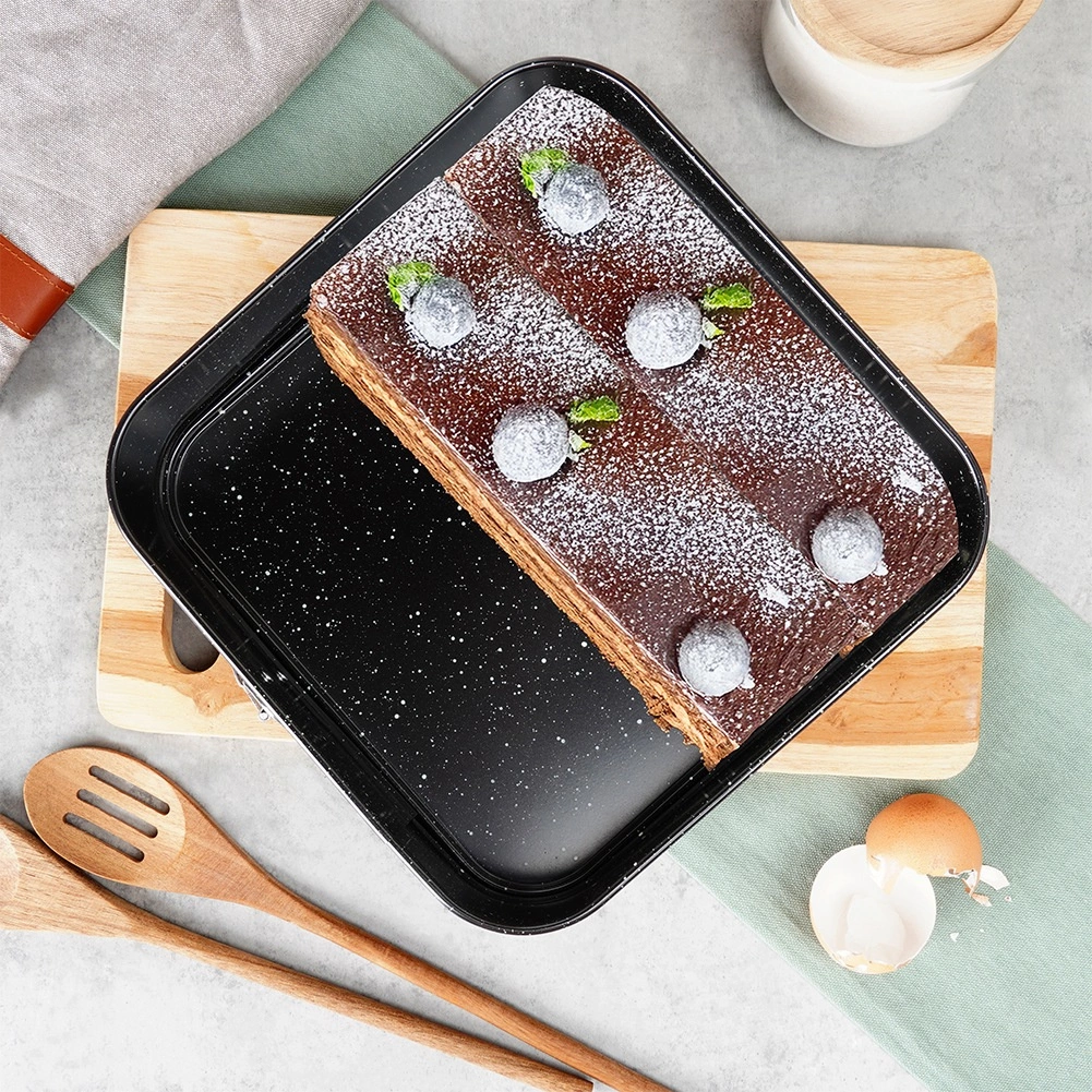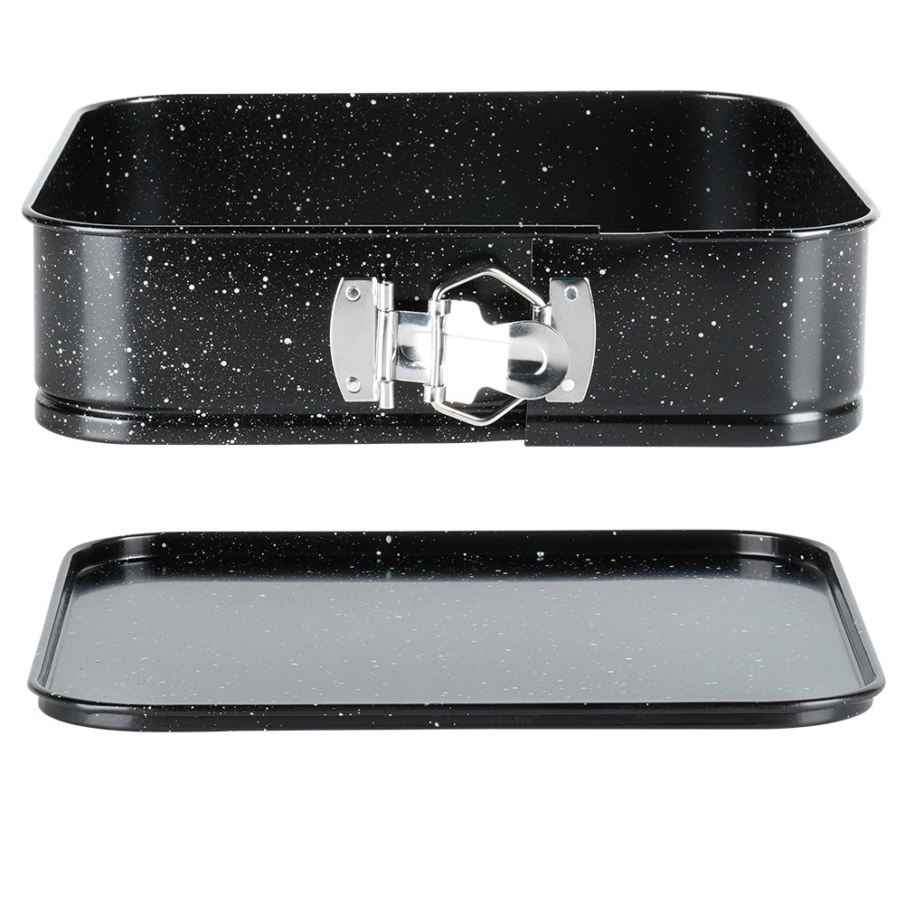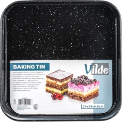 Ο στιβαρός ανθρακοχάλυβας εξασφαλίζει ομοιόμορφη κατανομή θερμότητας, είναι ανθεκτικός σε υψηλές θερμοκρασίες (έως 230 °C) και δεν απορροφά οσμές ή υγρά. Η φόρμα είναι κατάλληλη για φούρνους αερίου και ηλεκτρικούς και, χάρη στο τετράγωνο σχήμα της, είναι ιδανική για πίτες, κομμάτια, cheesecakes, βάσεις για τούρτες και αλμυρά φαγητά φούρνου.