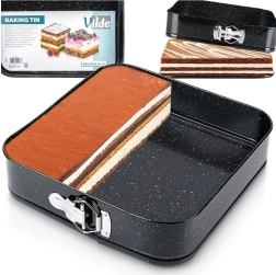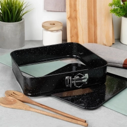 Πρακτική τετράγωνη φόρμα ψησίματος από ανθεκτικό ανθρακούχο ατσάλι με γρανιτένια επίστρωση για ομοιόμορφο ψήσιμο και εύκολη αφαίρεση των κέικ. Χάρη στα αποσπώμενα πλαϊνά και τον αποσπώμενο πάτο, ετοιμάζετε κέικ, cheesecake και φαγητά φούρνου χωρίς να κολλάνε και με ελάχιστο λίπος. Κατάλληλη για φούρνους αερίου και ηλεκτρικούς, ανθεκτική στη θερμότητα έως 230 °C.