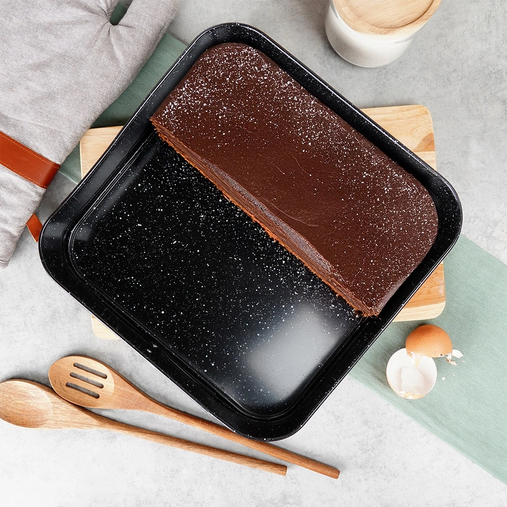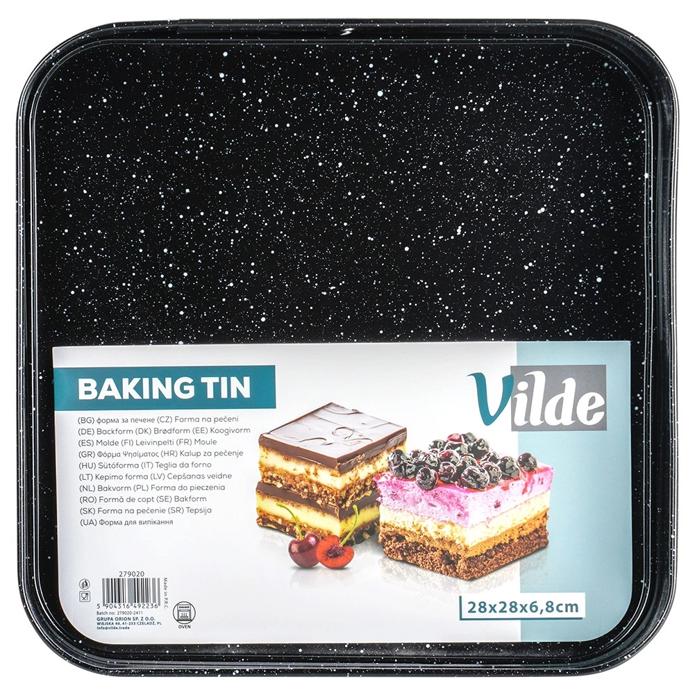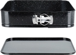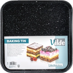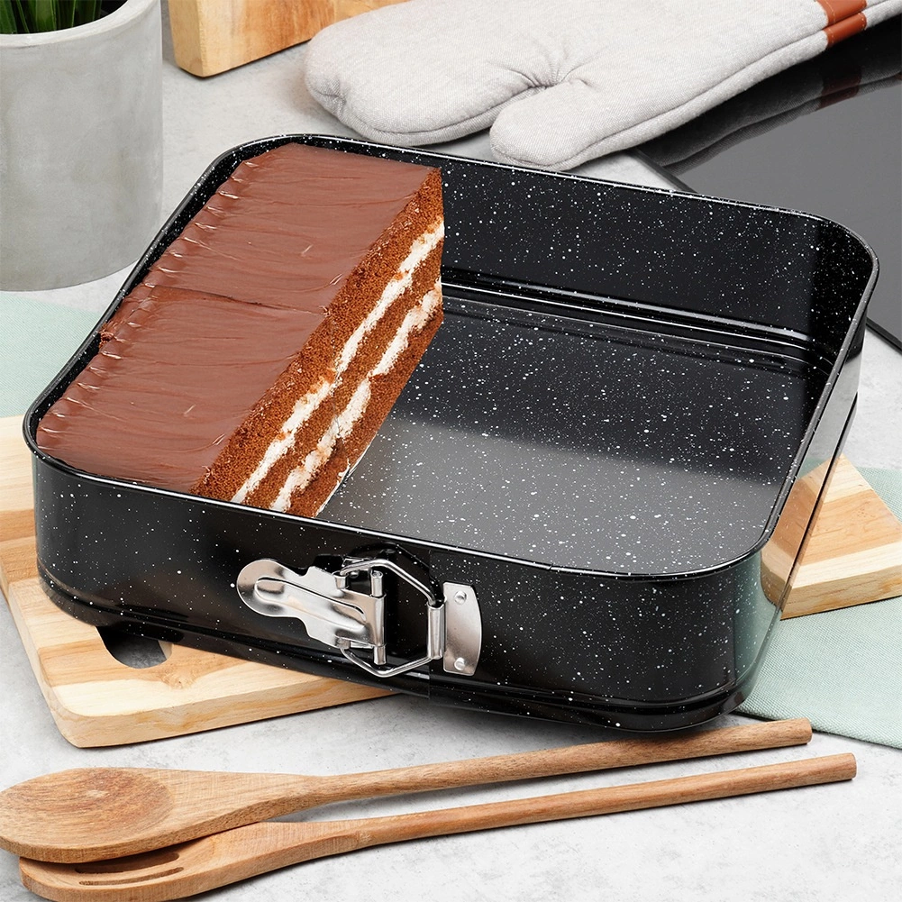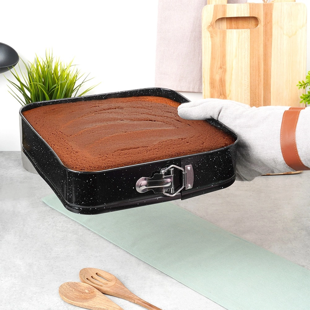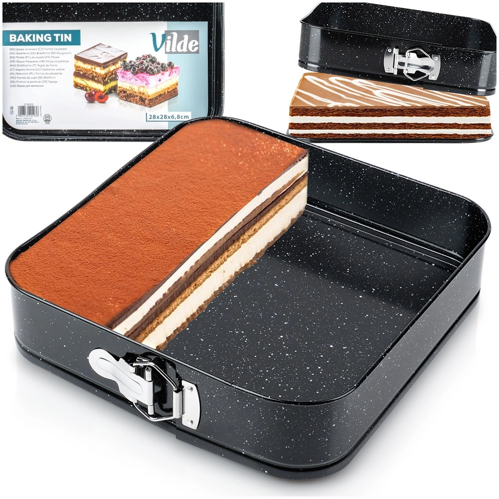 Αυτή η τετράγωνη αποσπώμενη φόρμα 28 × 28 × 6,8 cm είναι εξαιρετική επιλογή για καθημερινό ψήσιμο. Το σώμα από ποιοτικό ανθρακούχο ατσάλι με γρανιτένια επικάλυψη εξασφαλίζει άριστη αγωγιμότητα θερμότητας και περιορίζει το κάψιμο. Ανοίγει εύκολα με την πλαϊνή πόρπη και χάρη στον αποσπώμενο πάτο αφαιρείτε το ψημένο κέικ χωρίς να χαλάει το σχήμα.