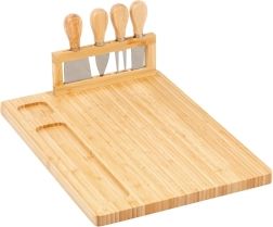 Αυτό το κομψό σετ 5 τεμαχίων συνδυάζει φυσική σανίδα μπαμπού με αυλάκι για μπισκότα ή ξηρούς καρπούς και πρακτική βάση για τα εργαλεία. Οι ανοξείδωτες λεπίδες και οι ξύλινες λαβές προσφέρουν άνετη και ακριβή κοπή σκληρών, ημίσκληρων και μαλακών τυριών. Το σετ αποτελεί υπέροχο δώρο και στολίδι για κάθε τραπέζι.