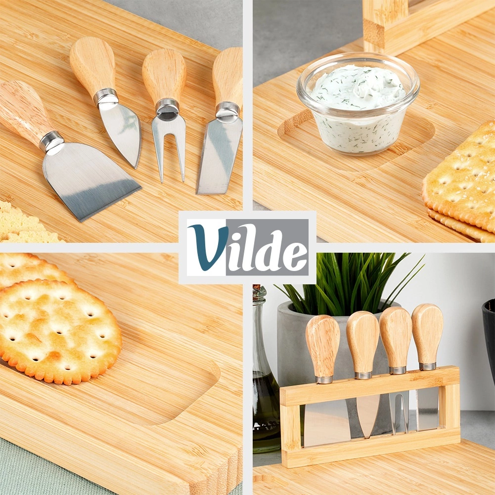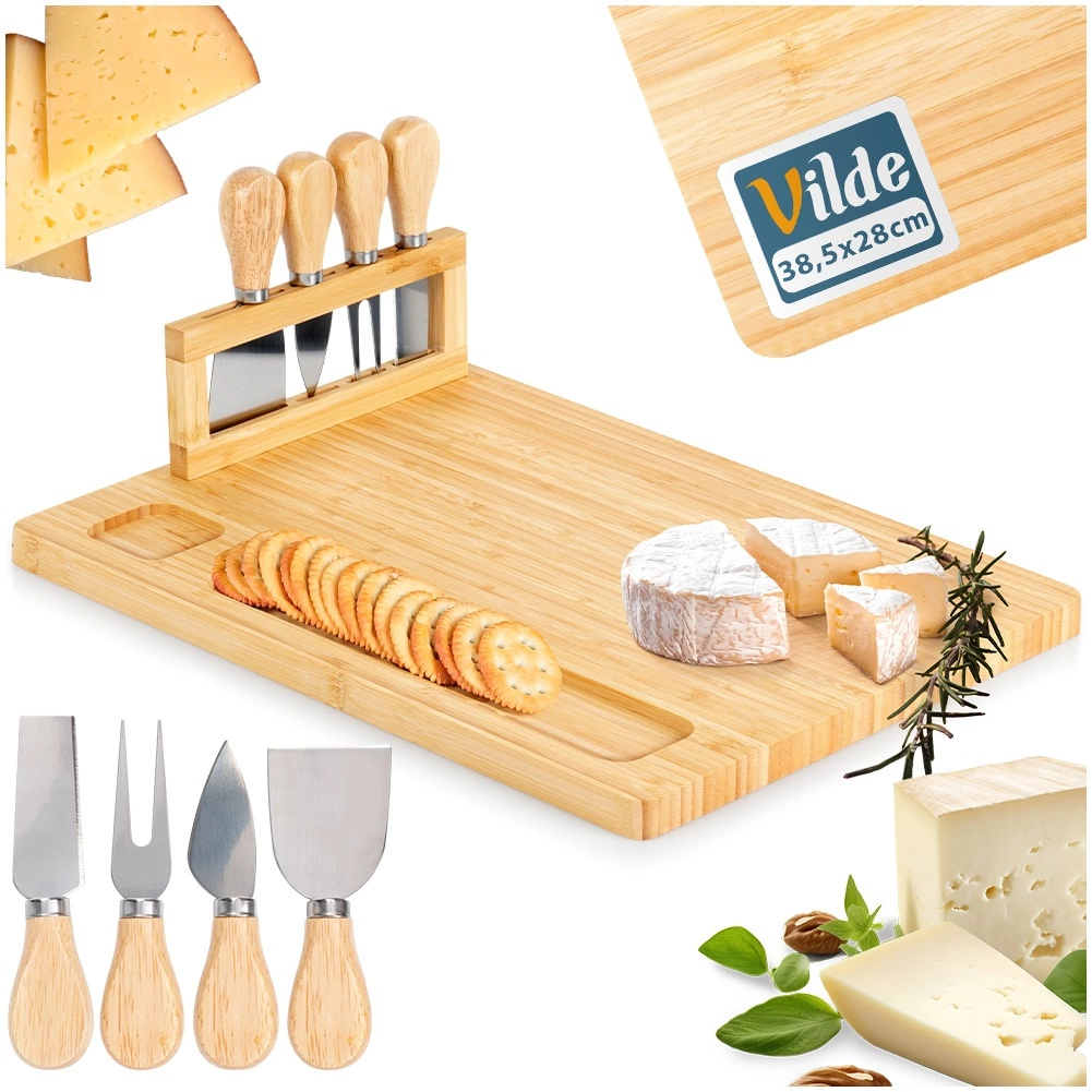Στιλάτο σετ για λάτρεις των τυριών: σανίδα μπαμπού με ενσωματωμένη βάση και τέσσερα εργαλεία από ανοξείδωτο ατσάλι. Ιδανικό για κοπή, τεμαχισμό και σερβίρισμα τυριών, αλλαντικών και σνακ. Το φυσικό μπαμπού είναι ανθεκτικό στην υγρασία, στεγνώνει γρήγορα και δεν απορροφά οσμές. Τέλειο για οικιακή χρήση, πάρτι και βραδιές με κρασί.