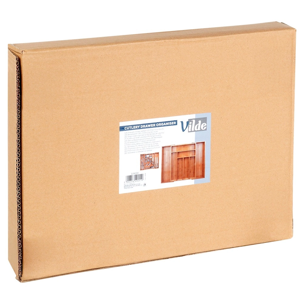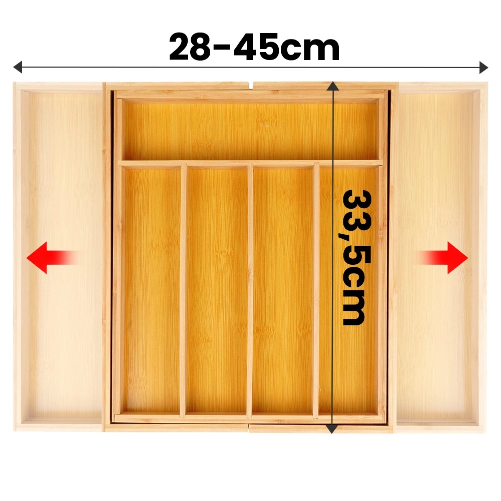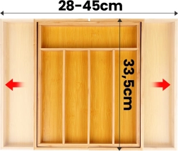 Οργανώστε την κουζίνα σας γρήγορα και αποτελεσματικά. Ο μπαμπού ένθετος διοργανωτής συρταριού με δυνατότητα επέκτασης από 35,5 έως 54,5 cm προσαρμόζεται στα περισσότερα τυπικά συρτάρια και προσφέρει άφθονο χώρο για μαχαιροπίρουνα, μαχαίρια και κουζινικά. Σε κλειστή θέση έχει διαστάσεις 45,5 × 35,5 × 5 cm, ενώ σε ανοιχτή 54,5 × 45,5 × 5 cm.