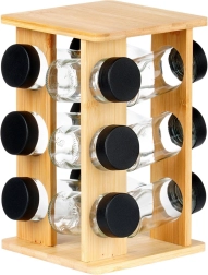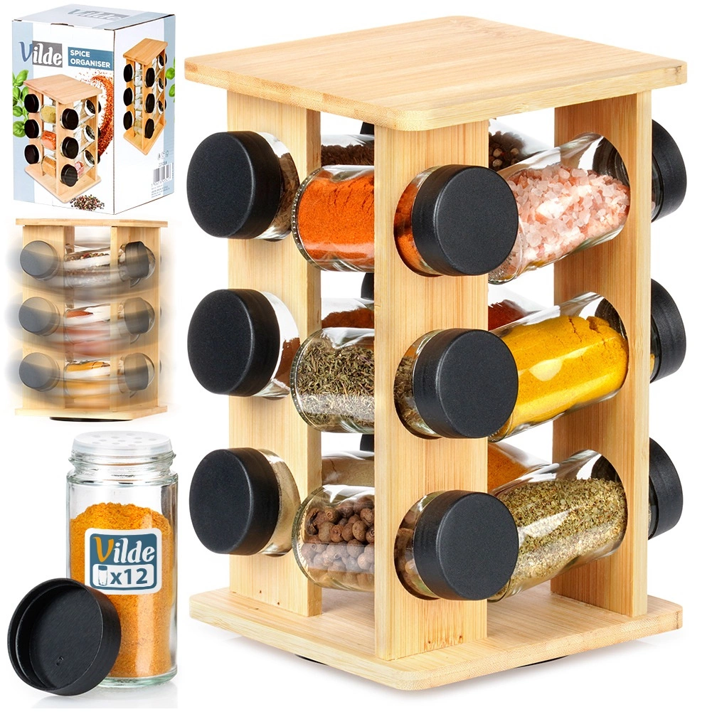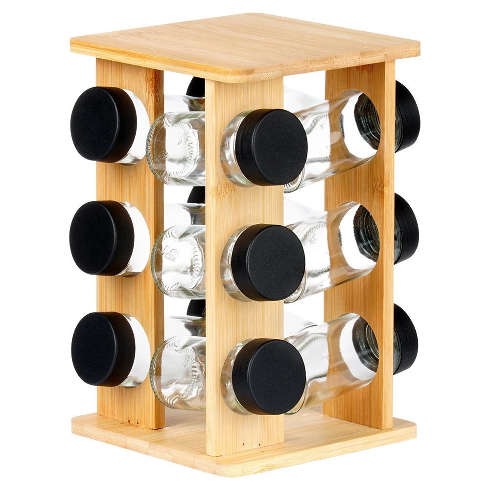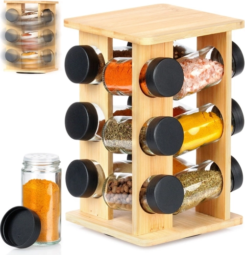 Κρατήστε τα μπαχαρικά σε απόσταση χεριού και σε τέλεια τάξη. Η περιστρεφόμενη βάση από φυσικό μπαμπού χωρά 12 γυάλινα βαζάκια μπαχαρικών με μαύρα βιδωτά καπάκια και λευκά σουρωτήρια για εύκολη δοσομέτρηση. Χάρη στον περιστρεφόμενο μηχανισμό βρίσκετε εύκολα το συστατικό που θέλετε, ενώ η συμπαγής κάθετη κατασκευή εξοικονομεί χώρο στον πάγκο και στο ντουλάπι.