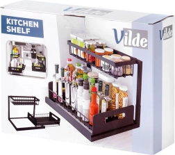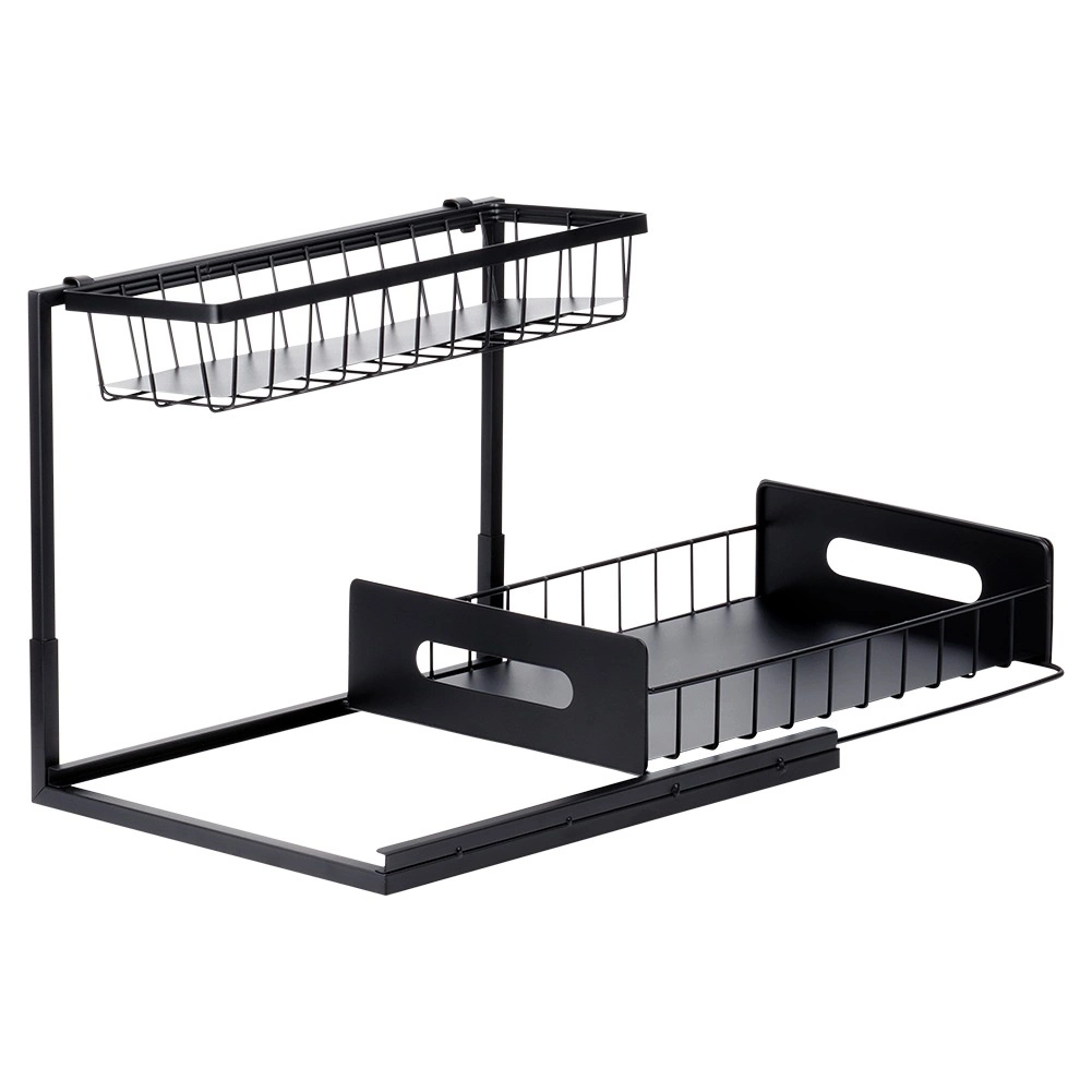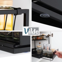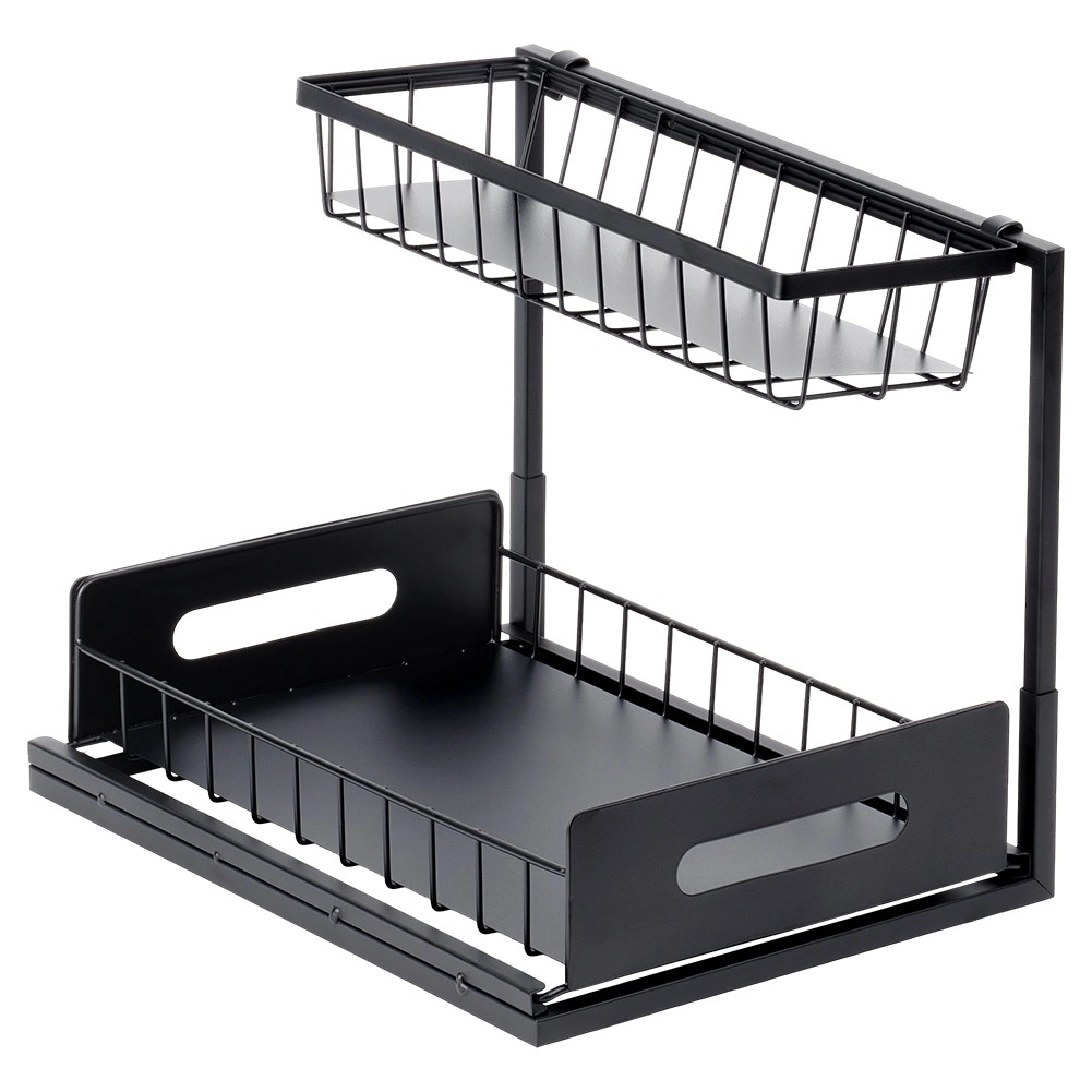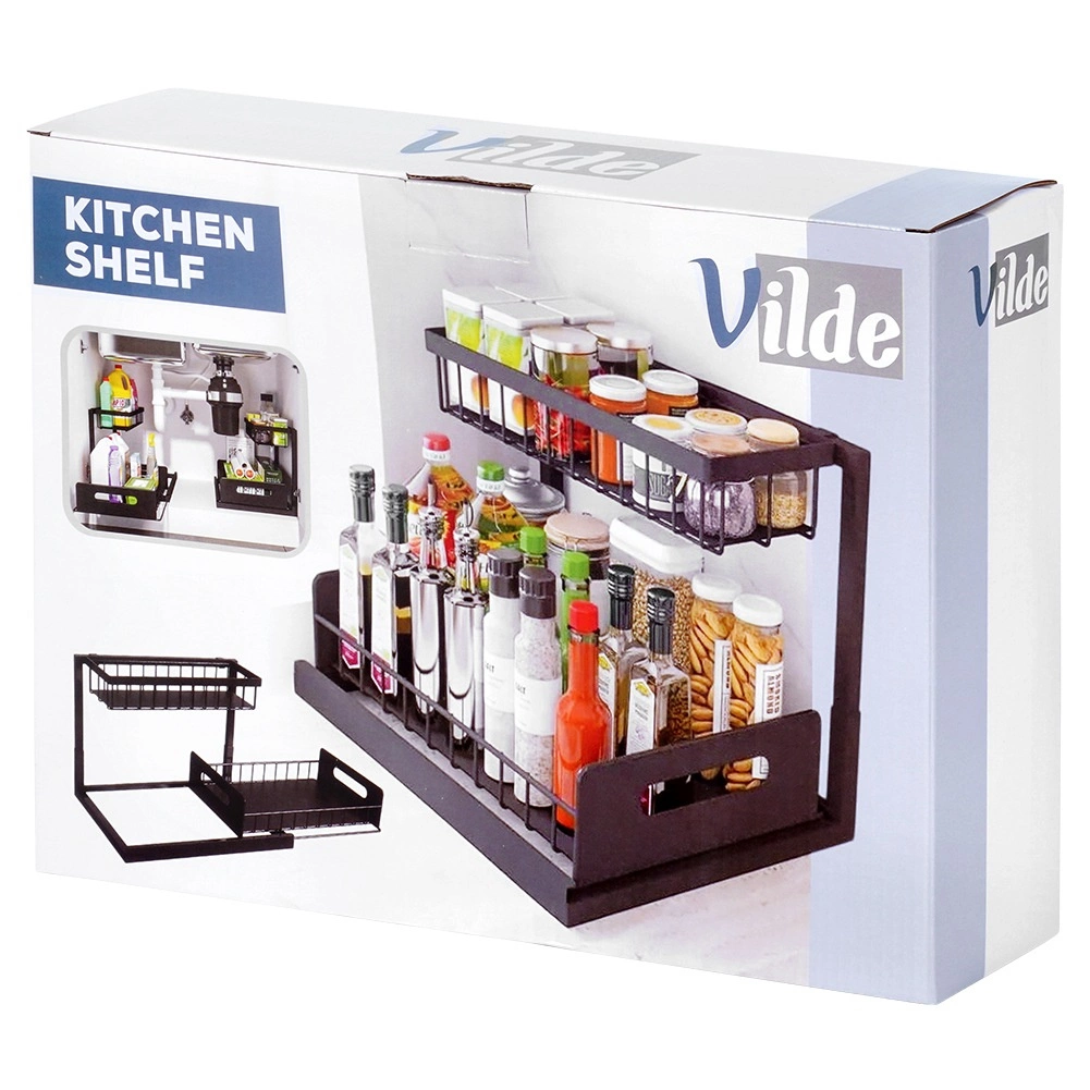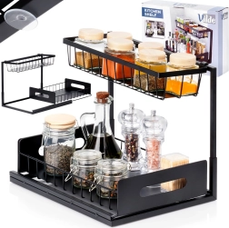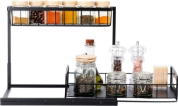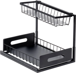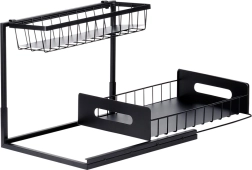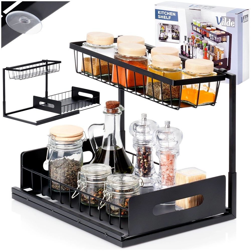Πρακτική διόροφη κουζινική ραφιέρα με συρόμενο κάτω συρτάρι από ανθεκτικό μέταλλο σε μαύρο χρώμα, για τακτοποιημένη αποθήκευση μπαχαρικών, βαζακίων και μικρών αξεσουάρ κουζίνας σε ένα σημείο. Το συρόμενο κάτω ράφι διευκολύνει την πρόσβαση, η σταθερή κατασκευή εξασφαλίζει αντοχή και οι πλαϊνές λαβές άνετη μεταφορά. Κατάλληλη για ντουλάπια, κάτω από τον νεροχύτη και πάνω στον πάγκο της κουζίνας.