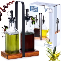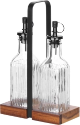 Αποκτήστε οργανωμένη και υγιεινή αποθήκευση καρυκευμάτων. Δύο διάφανα, ριγωτά γυάλινα μπουκάλια χωρητικότητας 190 ml το καθένα τοποθετούνται σε σταθερή βάση από ξύλο ακακίας με μαύρη μεταλλική λαβή για εύκολη μεταφορά. Κάθε μπουκάλι διαθέτει πρακτικό δοσομετρητή που επιβραδύνει τη ροή και βοηθά να ρίχνετε ακριβή ποσότητα χωρίς σταγόνες και χύσιμο.