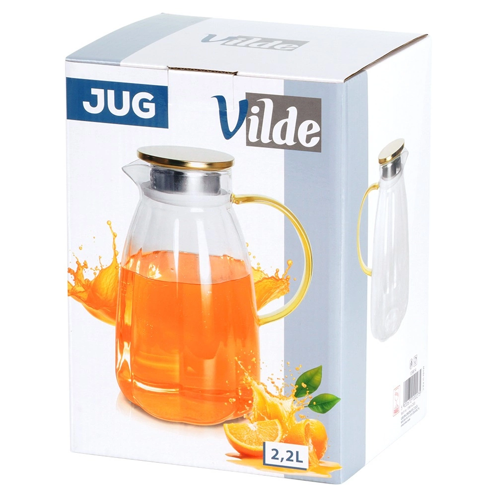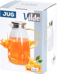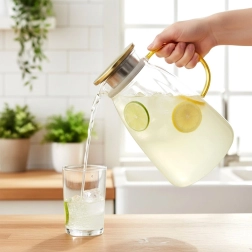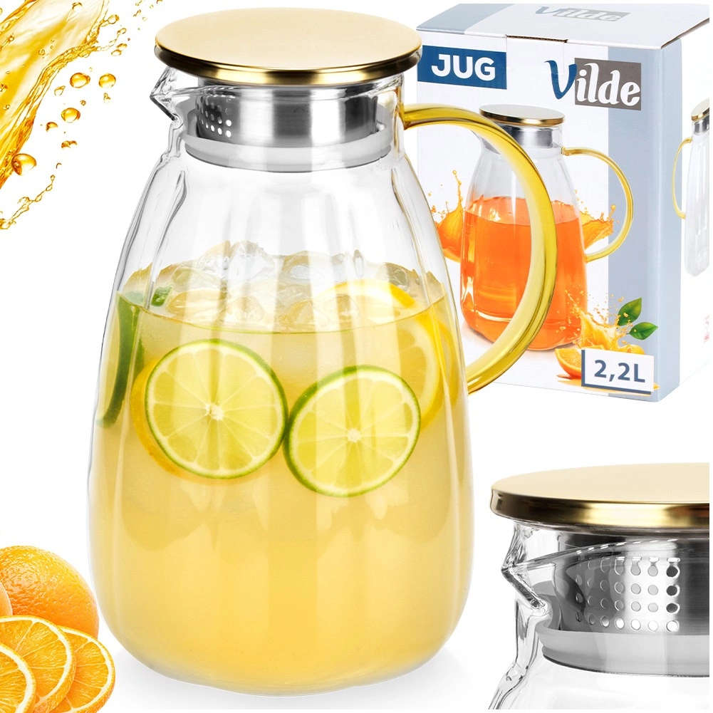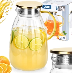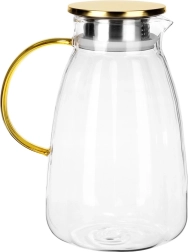 Στιλάτη και πρακτική γυάλινη κανάτα που ξεχωρίζει σε κάθε τραπέζι. Το διαφανές, υψηλής ποιότητας παχύ γυαλί αναδεικνύει όμορφα τα λεμόνια, τα βότανα ή τα παγάκια, ενώ το χρυσό ανοξείδωτο καπάκι προστατεύει το ποτό από ακαθαρσίες και έντομα. Η εργονομική κίτρινη λαβή και ο σχηματισμένος λαιμός εξασφαλίζουν ασφαλές και ακριβές σερβίρισμα χωρίς σταγόνες.